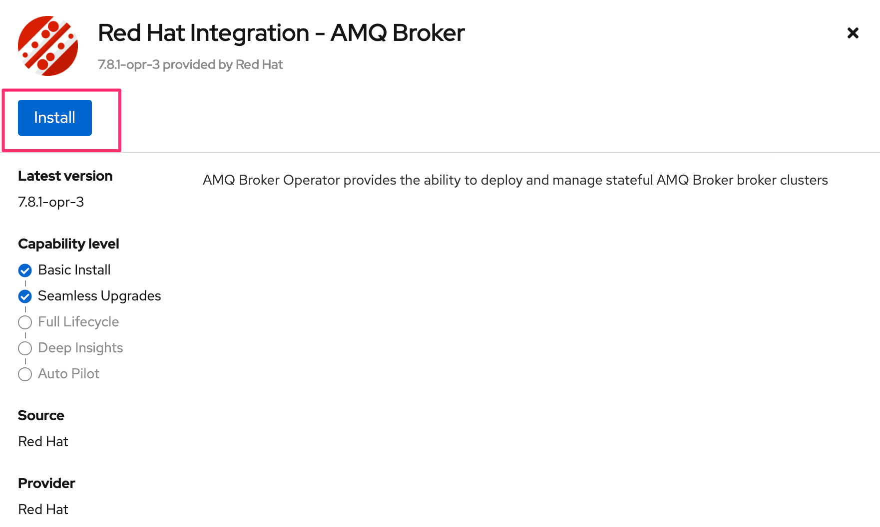 - In the OperatorHub, search for AMQ Broker, and in the Red Hat Integration - AMQ