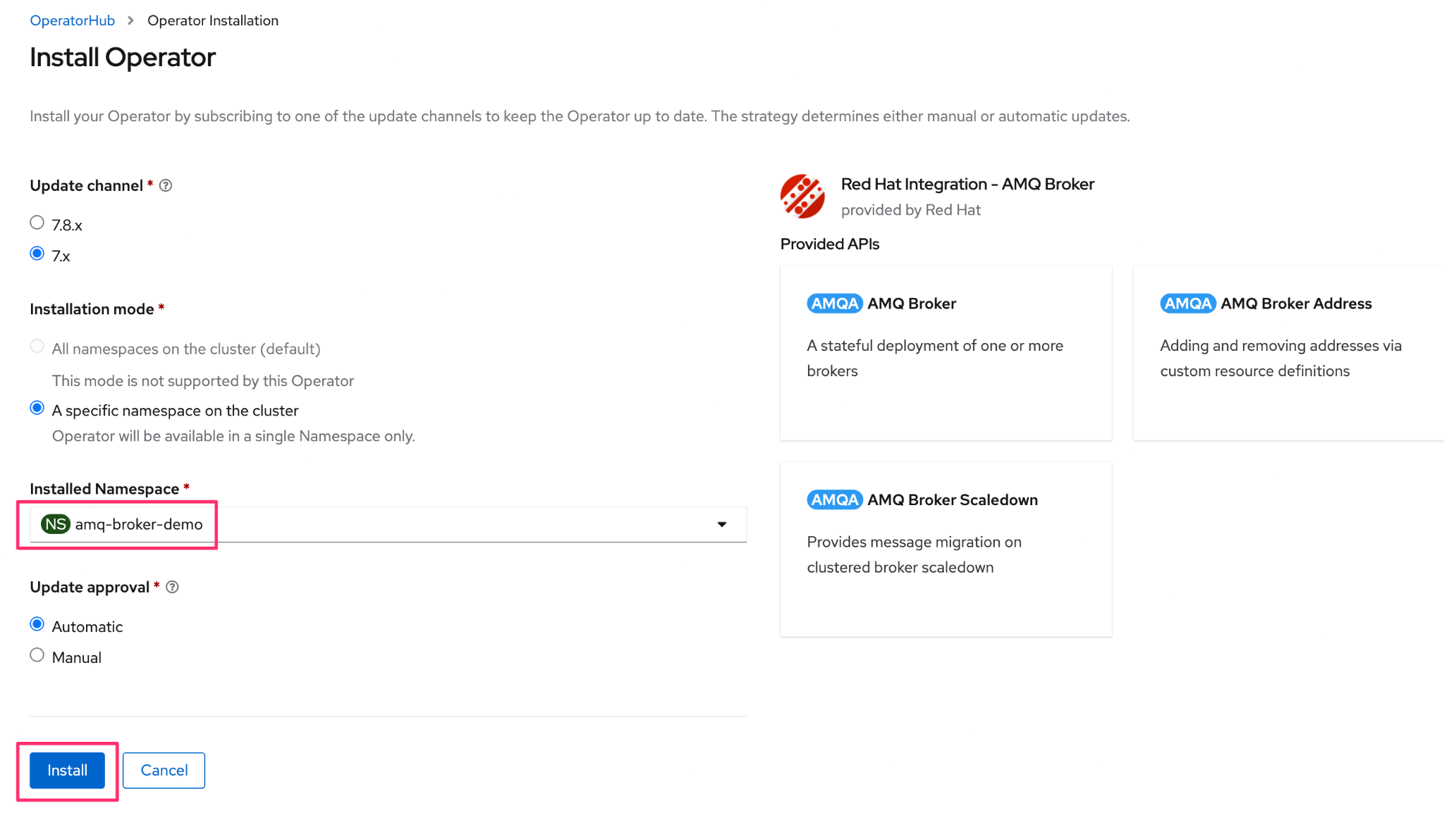 - First, install the AMQ Operator from the Operator Hub. In the OpenShift
