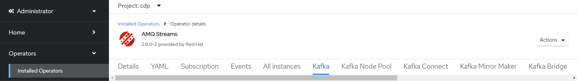 Note: Make sure to create a secret with username and password for Kafka user and create a Kafka user. For more information on creating user and secrets, refer and . - After creating the user account and secrets, in the Operator details section, for the AMQ