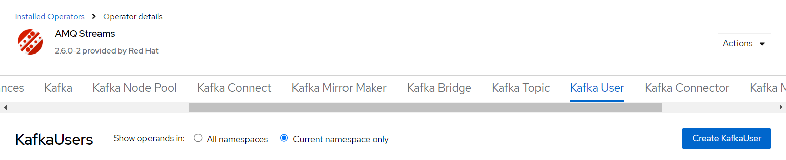 - In the AMQ Streams section, select Kafka User and click Create KafkaUser