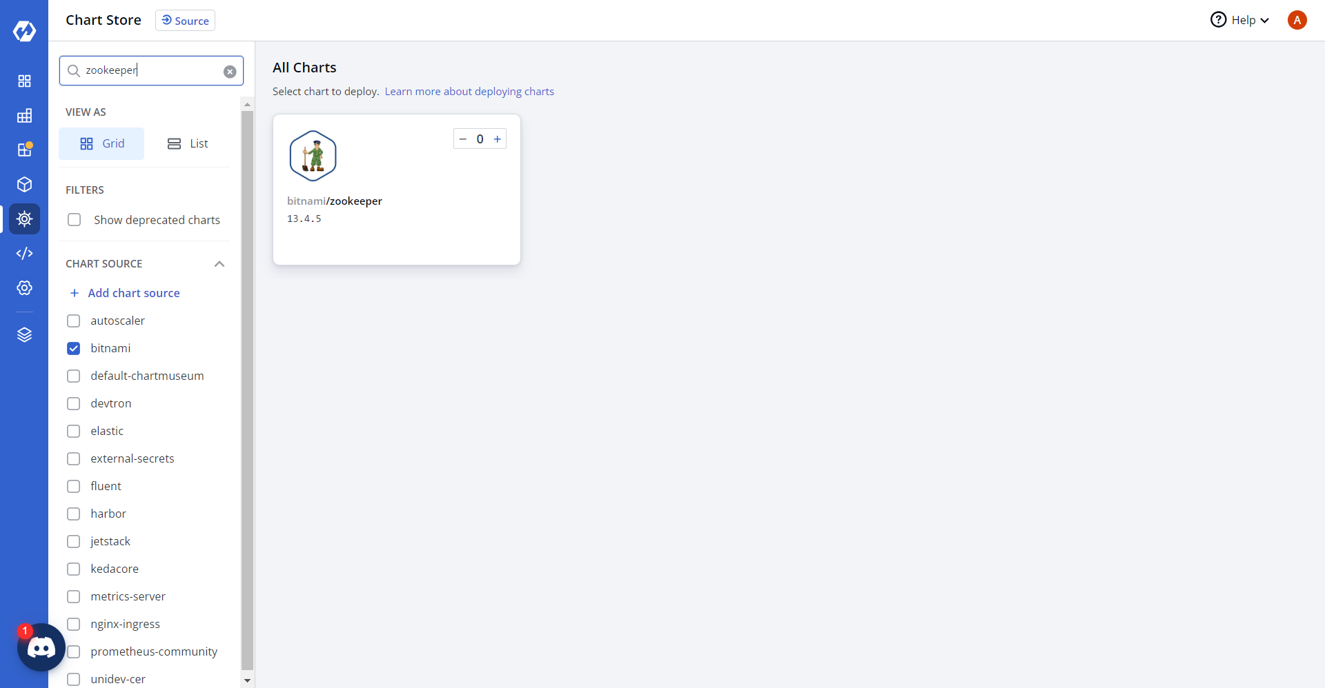 - Navigate to the Devtron Chart Store, and select the bitnami/zookeeper