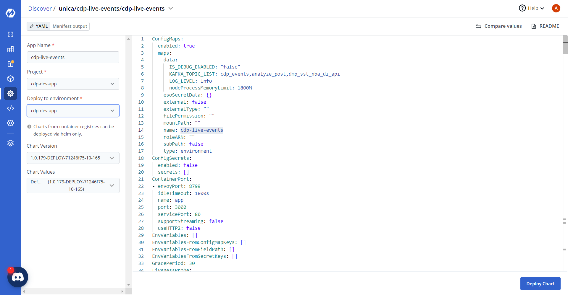3. In the YAML section, update the ConfigMap using below details, and deploy the charts.
