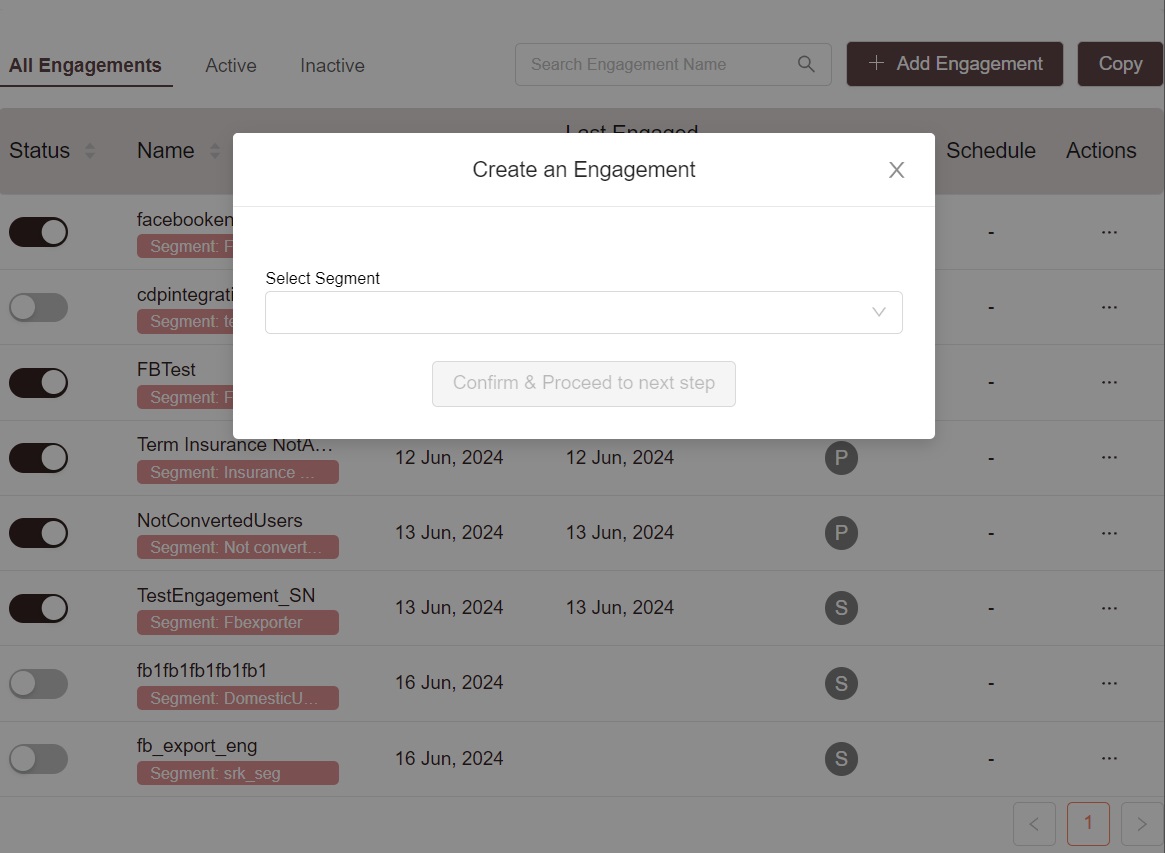 10. In the Status column, you can activate or deactivate the engagement at any time using the toggle switch.