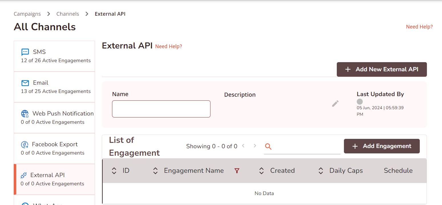 An External API allows seamless integration with a wide range of third-party services, enabling businesses to connect their systems with platforms such as CRMs, IVRs, private ESPs, SSPs, and more. By leveraging this capability, organizations can automate workflows, streamline engagements, and enhance operational efficiency.