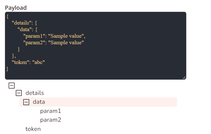 Global Level: In the global level, you define the payload for the API by entering the JSON payload in the code block. Ensure the JSON is valid, as any invalid JSON will trigger an error in the UI. If the payload is correct, a tree view will be deployed. In this view, you can add static or dynamic fields, create variables, and flexibly assign display terms. The tree structure allows you to organize parameters based on parent and child objects, making it easy to assign values.