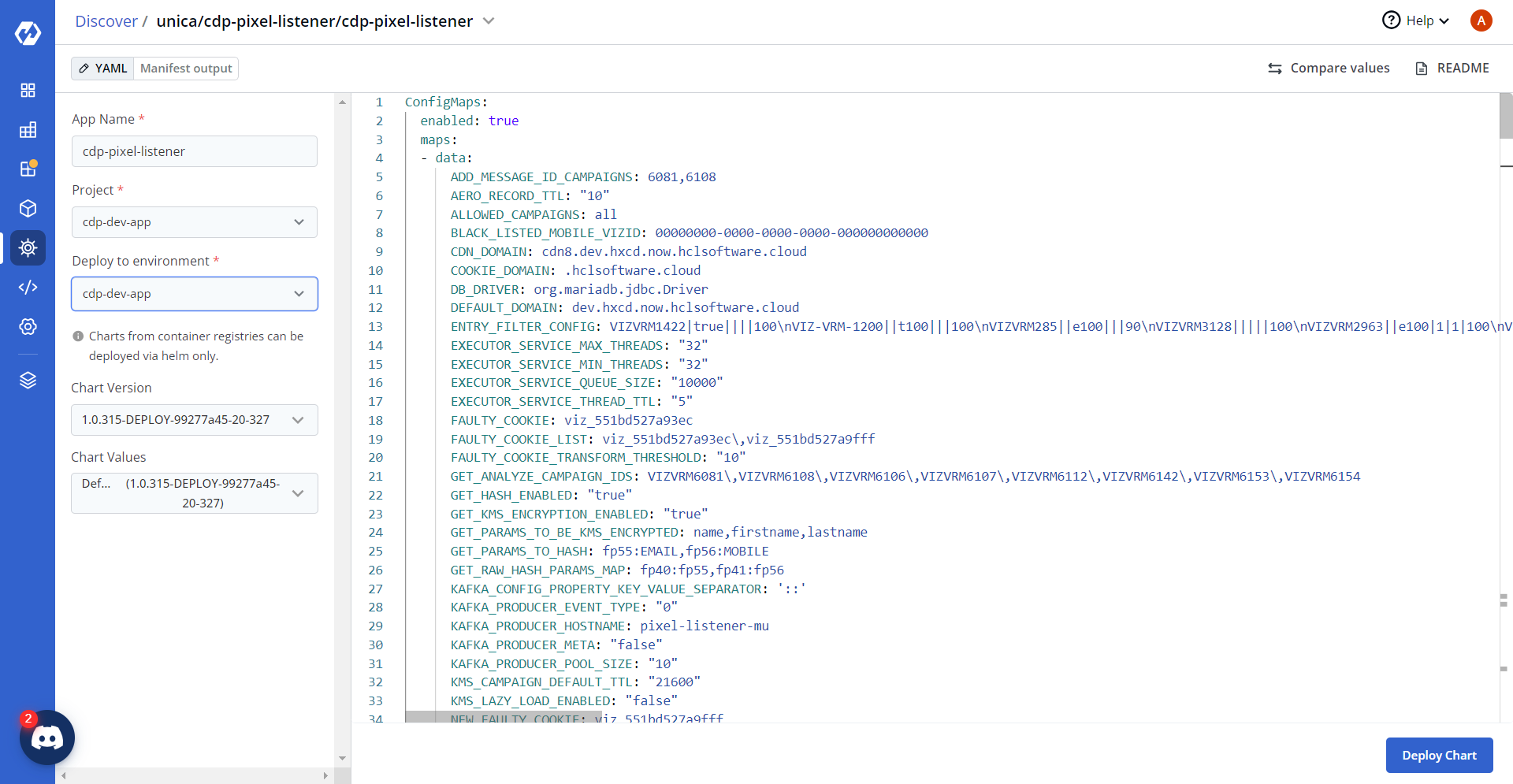 - In the YAML section, update the ConfigMap using below details, and deploy