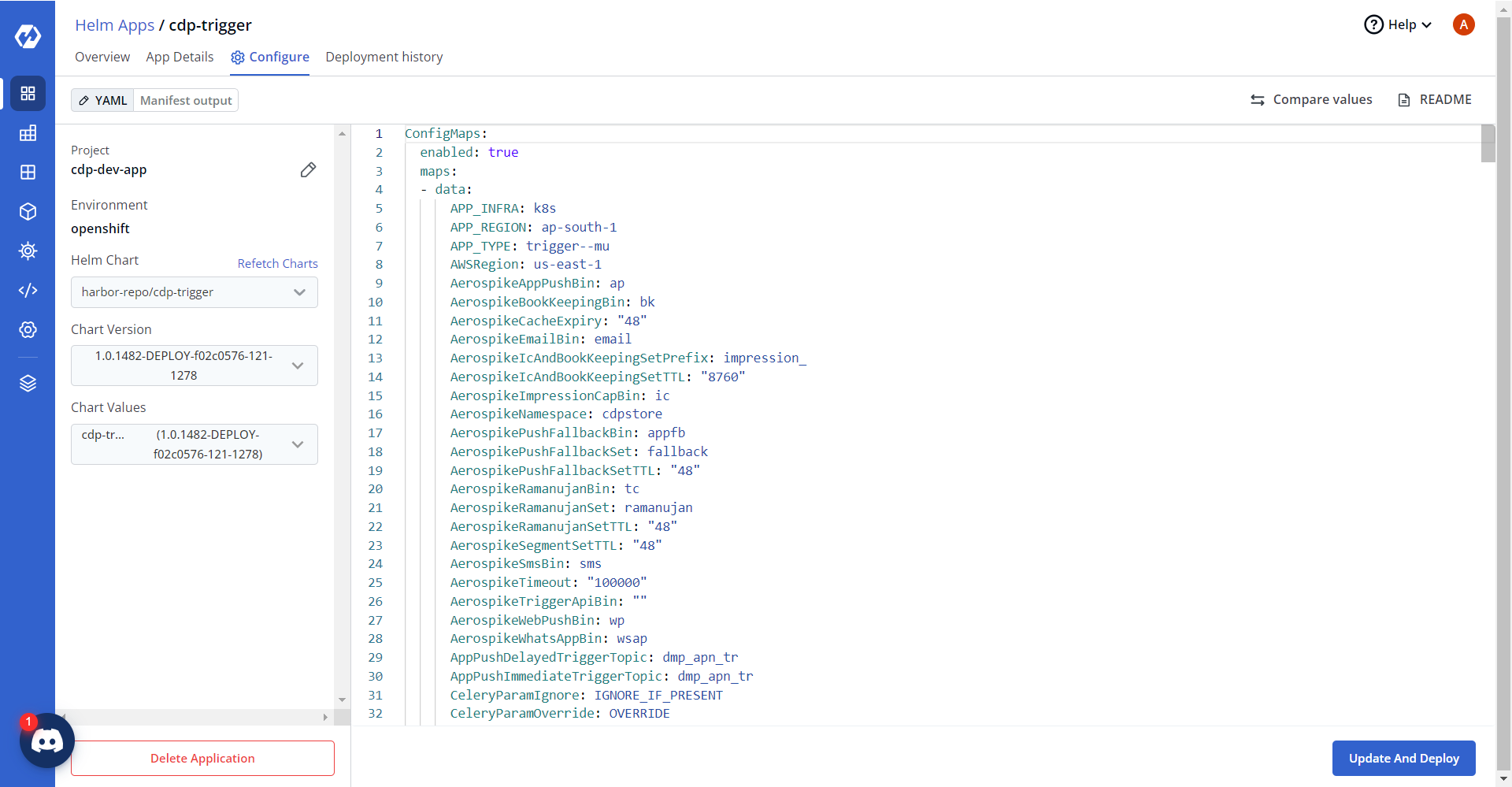 - In the YAML section, update the ConfigMap using the below details and deploy the chart.
