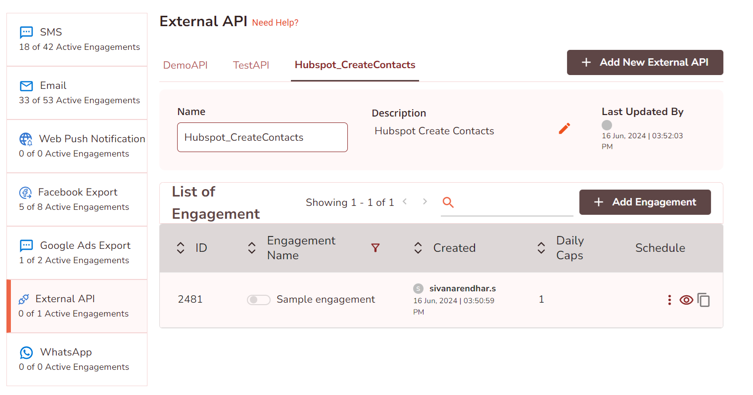 You can create engagement for Hubspot create contacts API either from Segments or Channels.