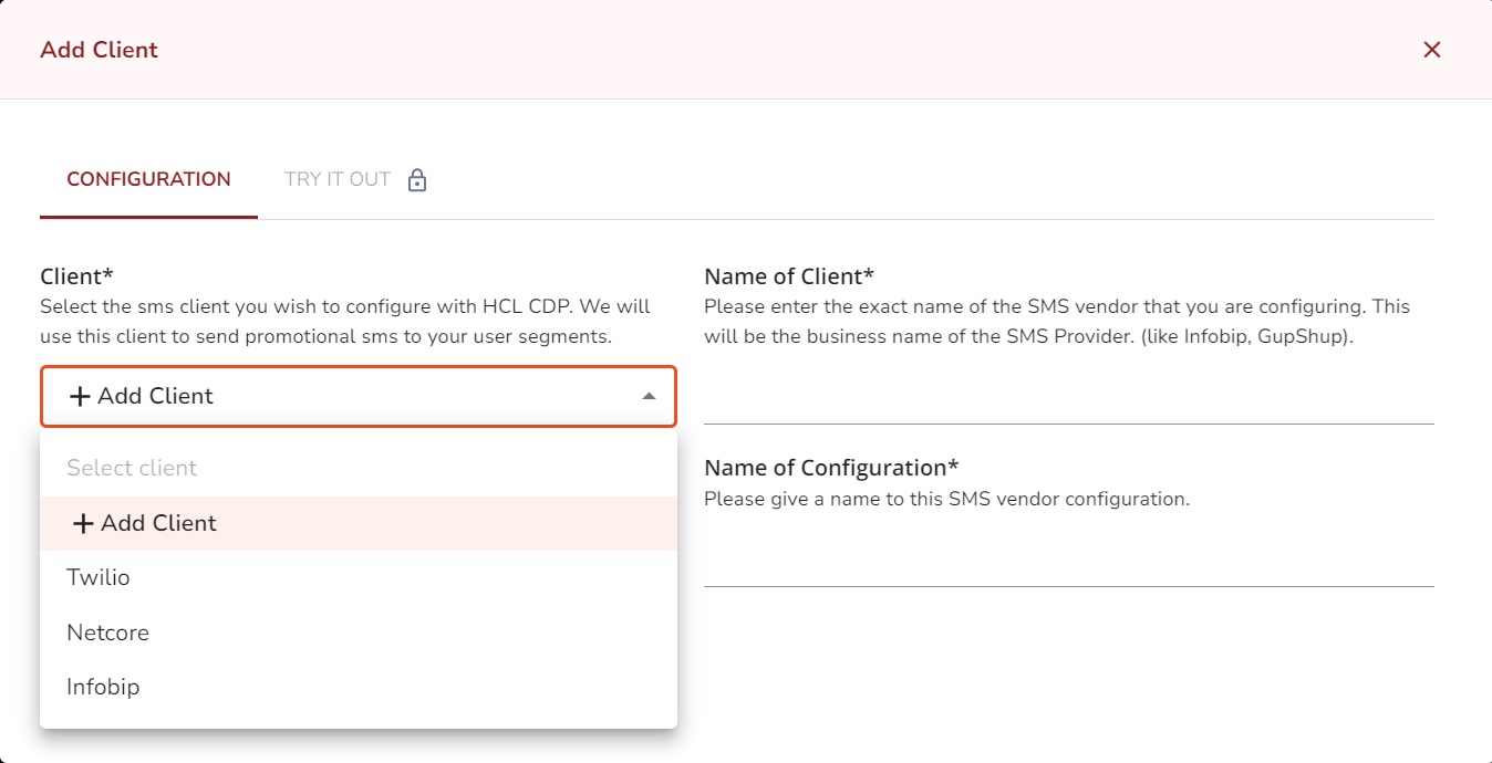 - In the BASIC DETAILS section, in the Name textbox, enter name of the configuration, and in the Description field, enter the description for the new SMS client.