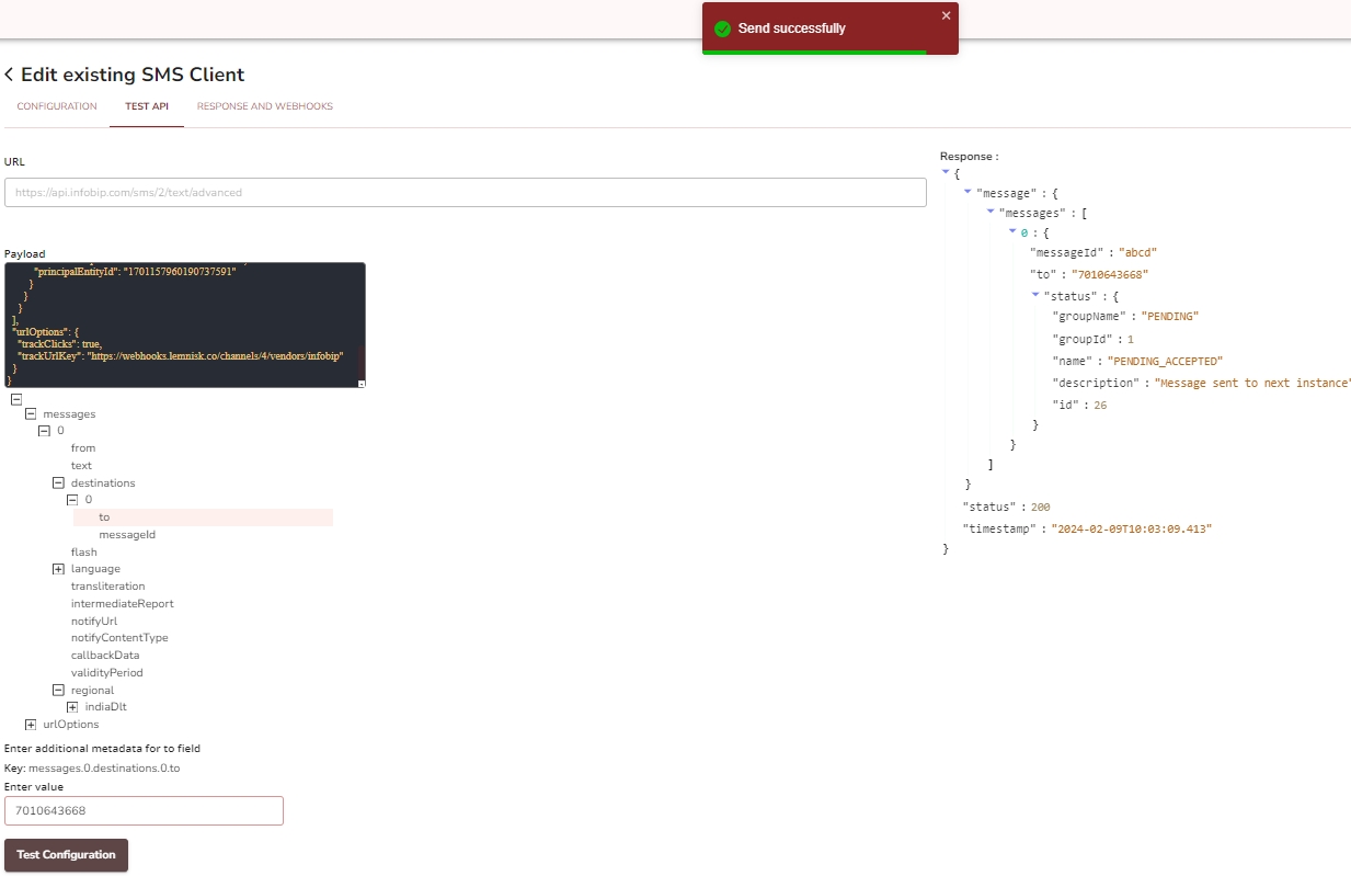 - Assign values to the payload and click Test Configuration.