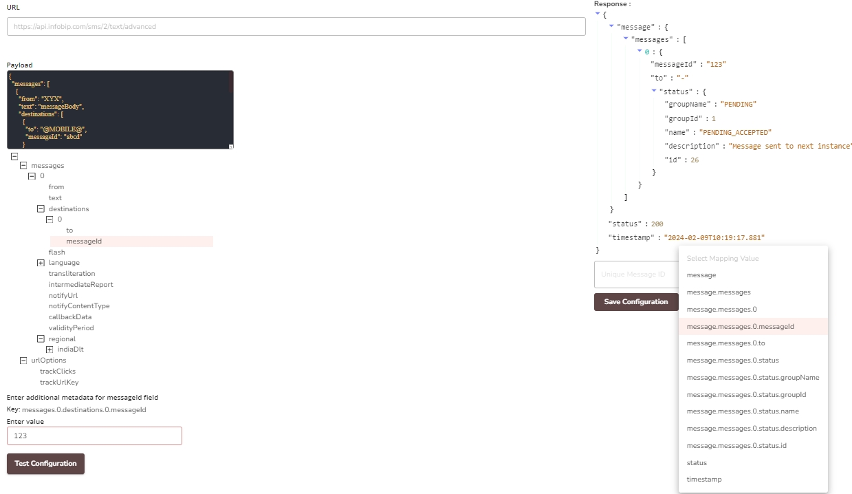The response and Webhooks screen is where you map the relevant path of the response body to the internal "MessageID" identifier. This mapping allows HCL CDP to identify each message trigger and track delivery reports.
