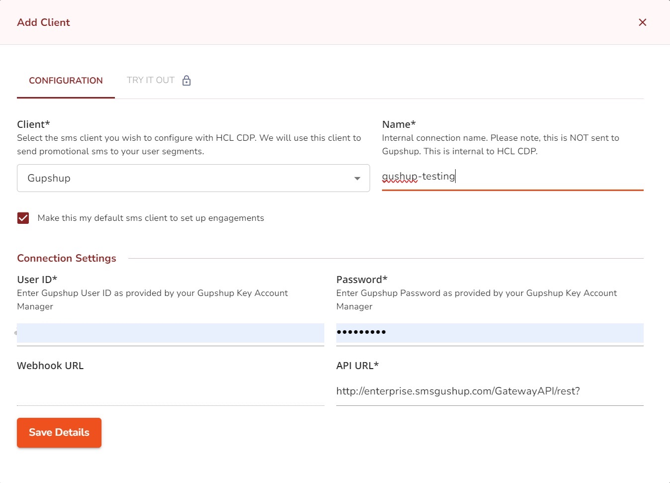 - Password: Enter the password provided by the Gupshup team. Contact Gupshup and get your User ID and Password.