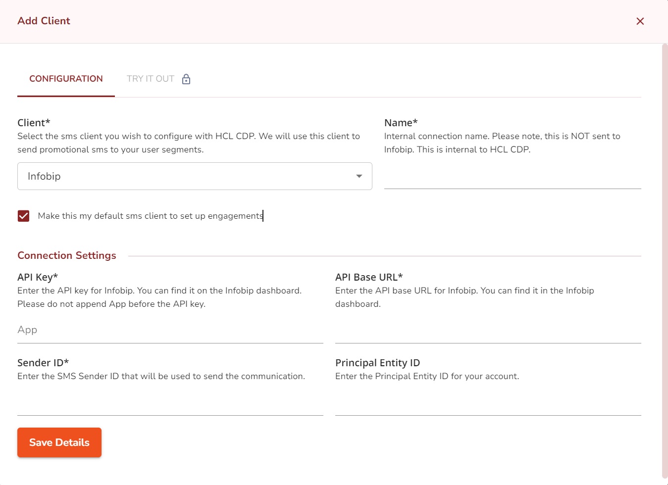 - In the Add Client page, on the CONFIGURATION tab, in the Client field, select Infobip from the list of SSPs.