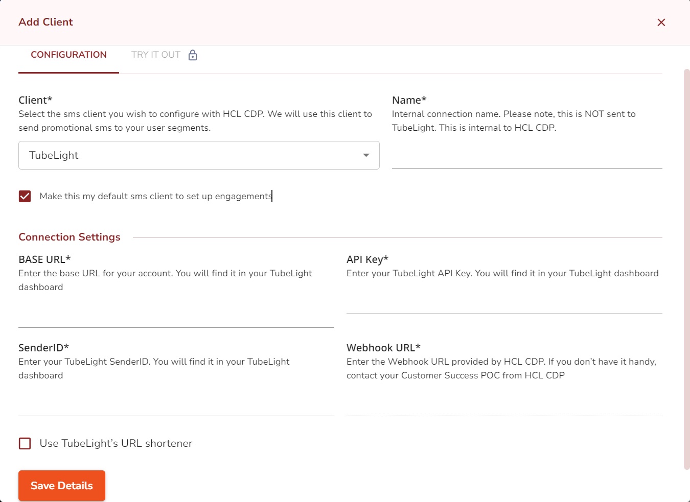 - Use TubeLight’s URL shortener: select this check box to use Tubelight's URL shortener in your SSP configuration. By default, the configuration will use HCL CDP's URL shortener.