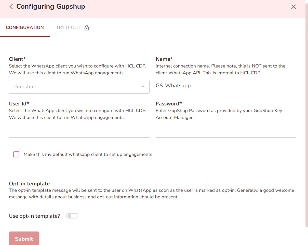 HCL CDP allows you to create WhatsApp campaigns, but the delivery of messages to your target audience is handled by a WhatsApp Service Provider (WSP) such as Yellow Messenger, Gupshup, or Infobip. To start creating WhatsApp engagements, you must first configure at least one WSP.