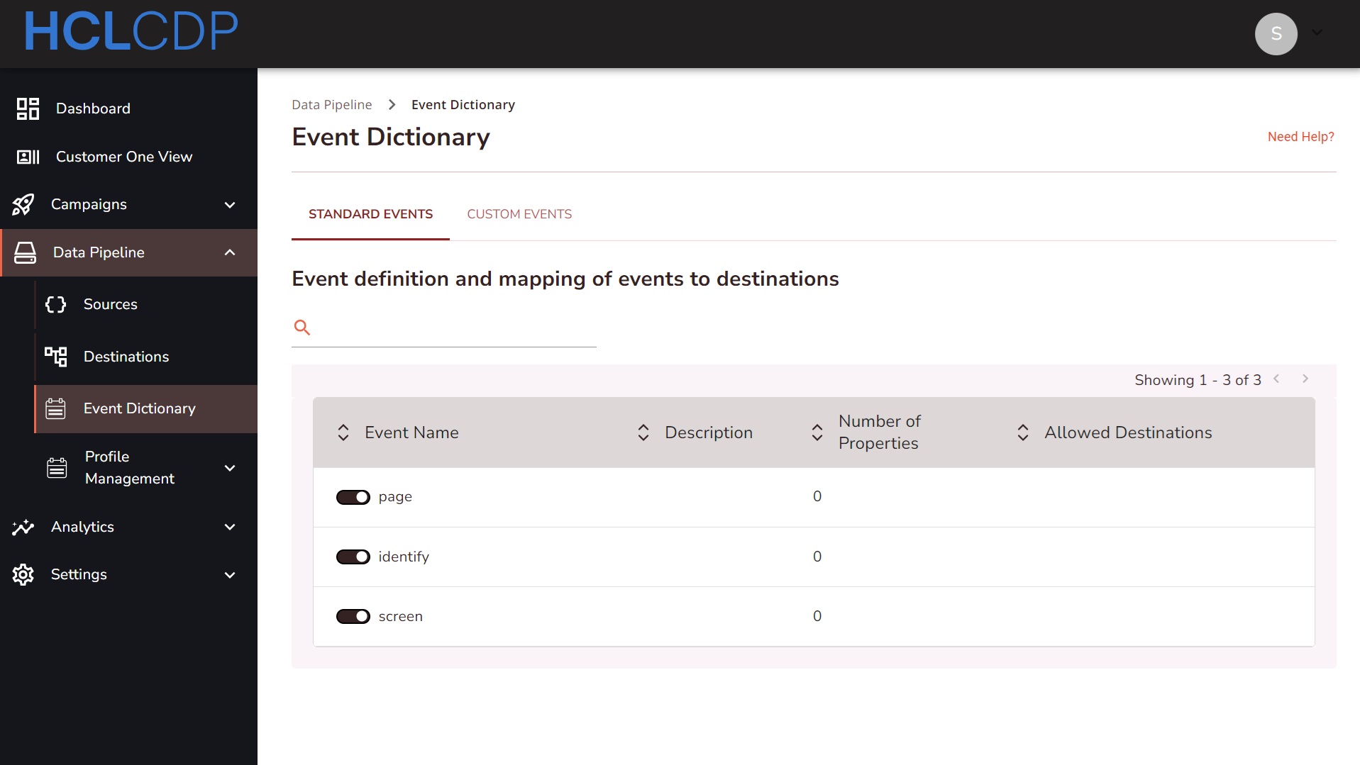 Standard events are pre-configured by HCL CDP, and include the following methods page, screen and identify.