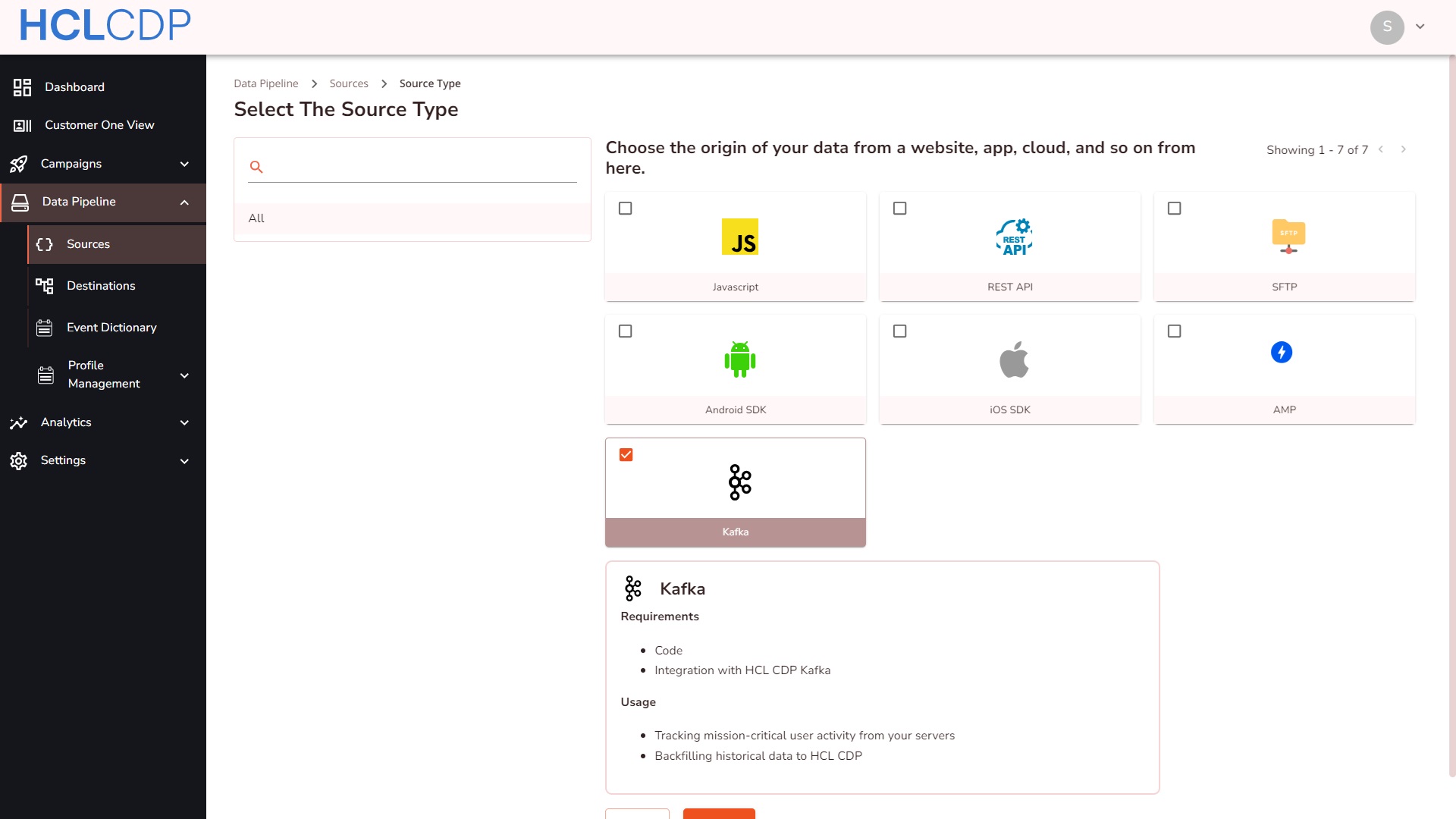 Kafka serves as a source in HCL CDP, enabling data transfer from your Kafka producers to HCL CDP. It is ideal for handling high volumes of streaming data in real-time.