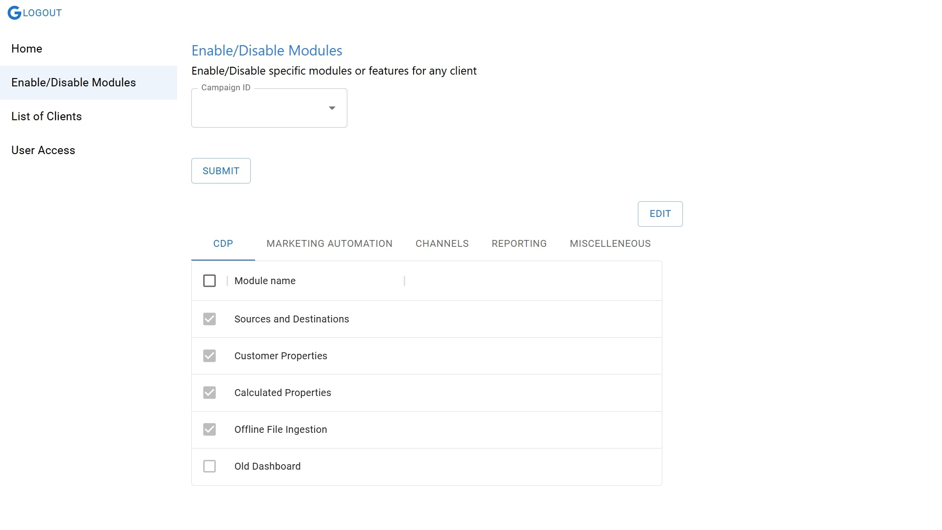 - In the Admin portal, on the left pane, click Enable/Disable Modules.