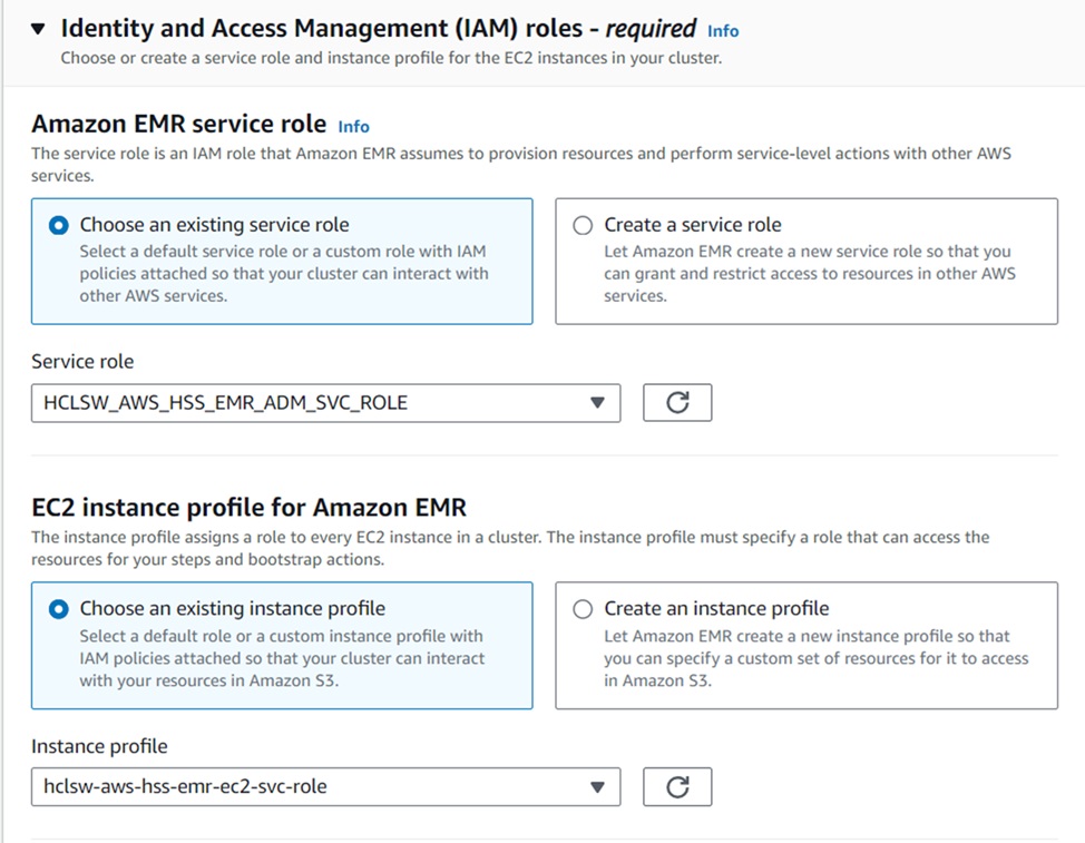 - Select the Custom EMR Service Role and EC2 instance Profile Role as shown below, and