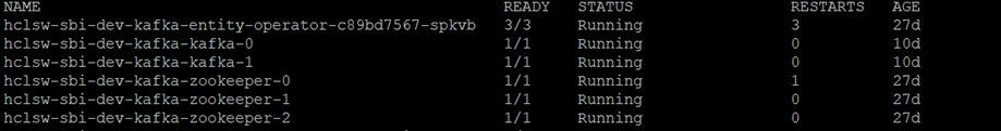 apiVersion: kafka.strimzi.io/v1beta2x kind: Kafka metadata: labels: app: sbi-kafka name: hclsw-sbi-dev-kafka namespace: kafka-ns spec: entityOperator: topicOperator: {} userOperator: {} kafka: authorization: superUsers: - hclsw-sbi-kafka-user type: simple config: default.replication.factor: 2 inter.broker.protocol.version: '3.6' min.insync.replicas: 2 offsets.topic.replication.factor: 2 transaction.state.log.min.isr: 2 transaction.state.log.replication.factor: 2 listeners: - authentication: type: scram-sha-512 configuration: preferredNodePortAddressType: Hostname name: external port: 9094 tls: false type: nodeport - authentication: type: scram-sha-512 name: internal port: 9092 tls: false type: internal replicas: 2 resources: limits: cpu: '4' ephemeral-storage: 20Gi memory: 8Gi requests: cpu: '2' ephemeral-storage: 20Gi memory: 2Gi storage: class: nfssc deleteClaim: false size: '20' type: persistent-claim version: 3.6.0 zookeeper: replicas: 3 resources: limits: cpu: '4' ephemeral-storage: 20Gi memory: 8Gi requests: cpu: '2' ephemeral-storage: 20Gi memory: 2Gi storage: class: nfssc deleteClaim: true size: 20Gi type: persistent-claim - On successful deployment of cluster, the two broker pods and three zookeeper pods will be