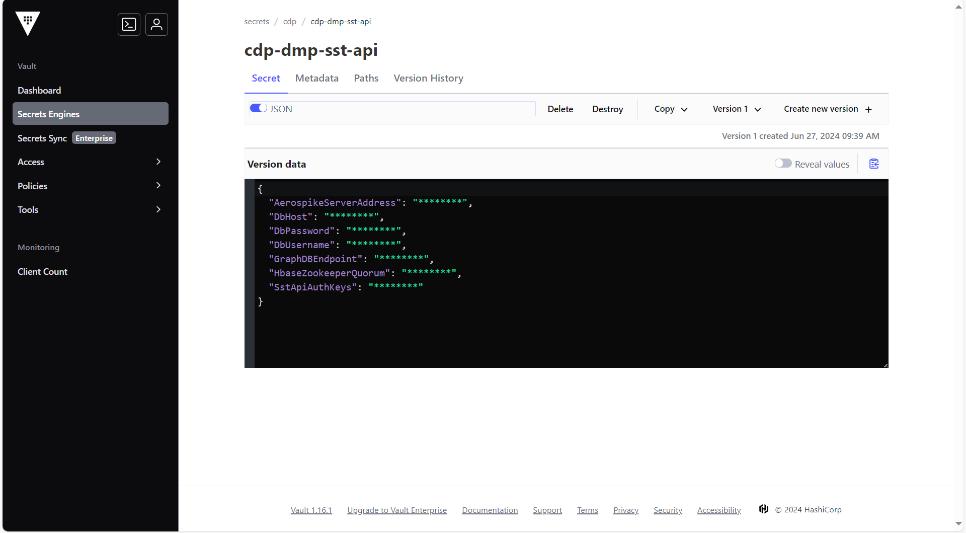 To create the cdp-dmp-sst-api secret in the HashiCorp Vault, follow the steps below: