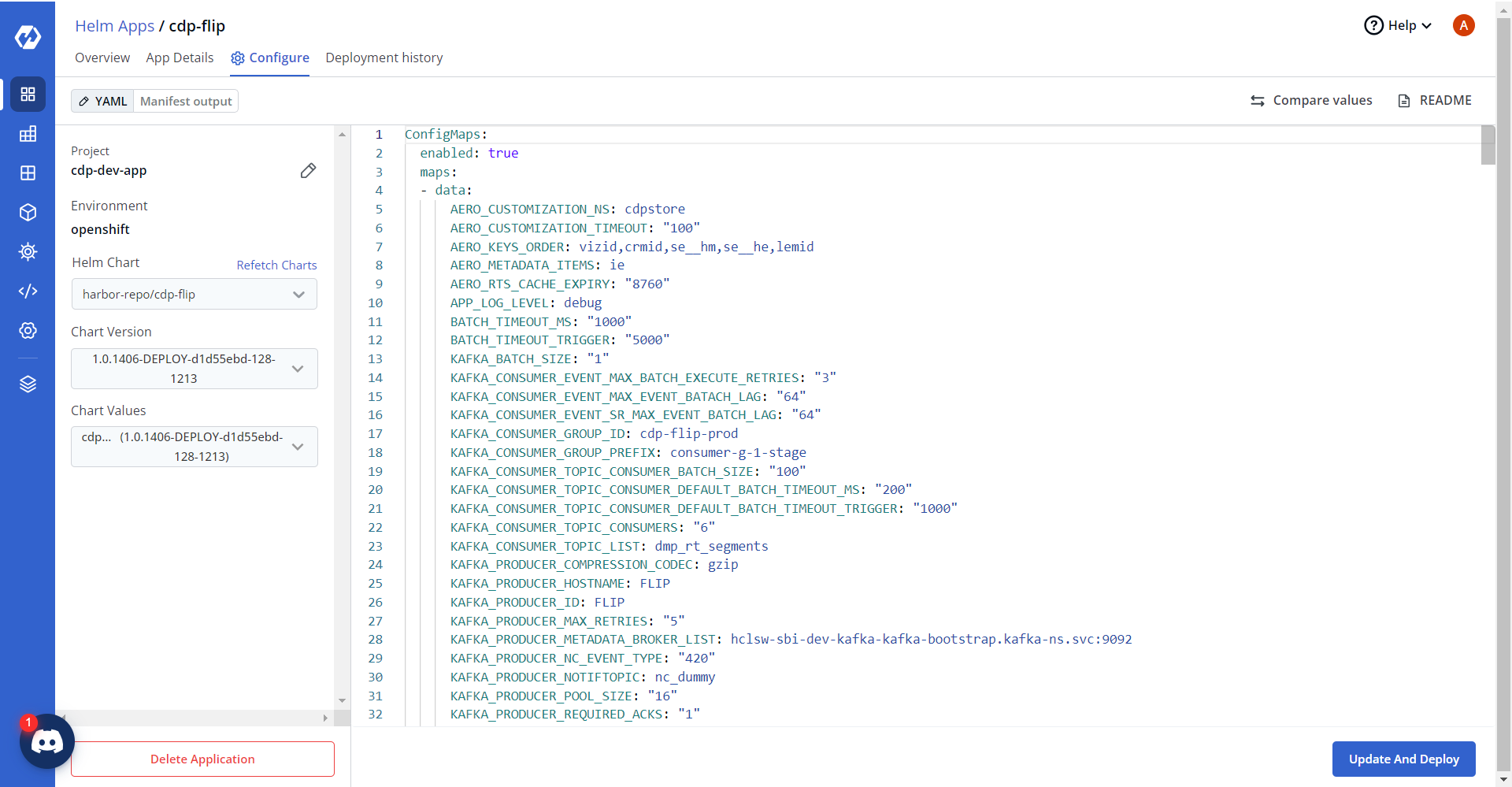{ "CUSTOMIZATION_AERO_CLUSTER": "<CUSTOMIZATION_AERO_CLUSTER>", "DB_PASSWORD": "<DB_PASSWORD>", "DB_URL": "<DB_URL>", "DB_USERNAME": "<DB_USERNAME>", "KAFKA_CONSUMER_PREFIX": "flip", "KAFKA_TOPIC_LIST": "dmp_rt_segments", "KafkaConsumerConfig": "<KafkaConsumerConfig>" } - Create separate service account cdp-dev-app-sa with appropriate roles and permissions, and update ConfigMaps data with actual values.