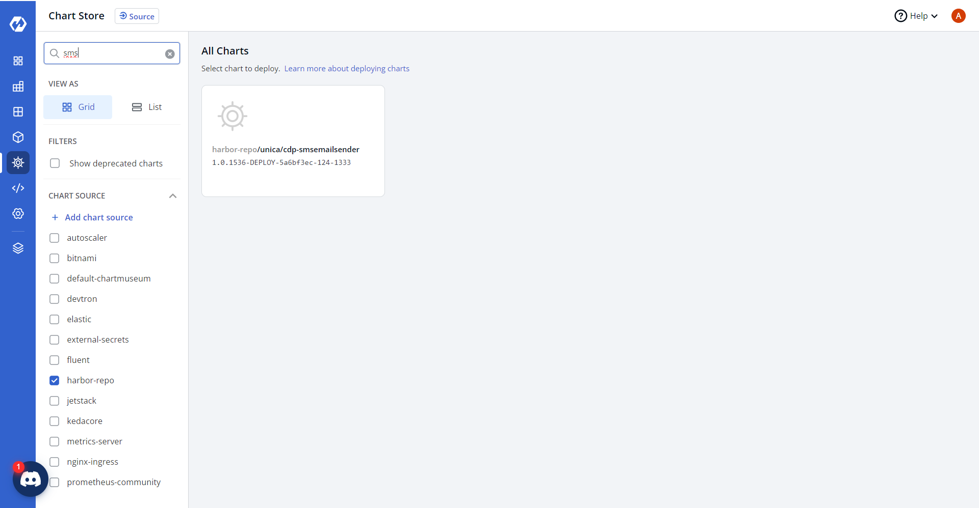 - Navigate to the Devtron Chart Store, and select the cdp-smsemailsender chart