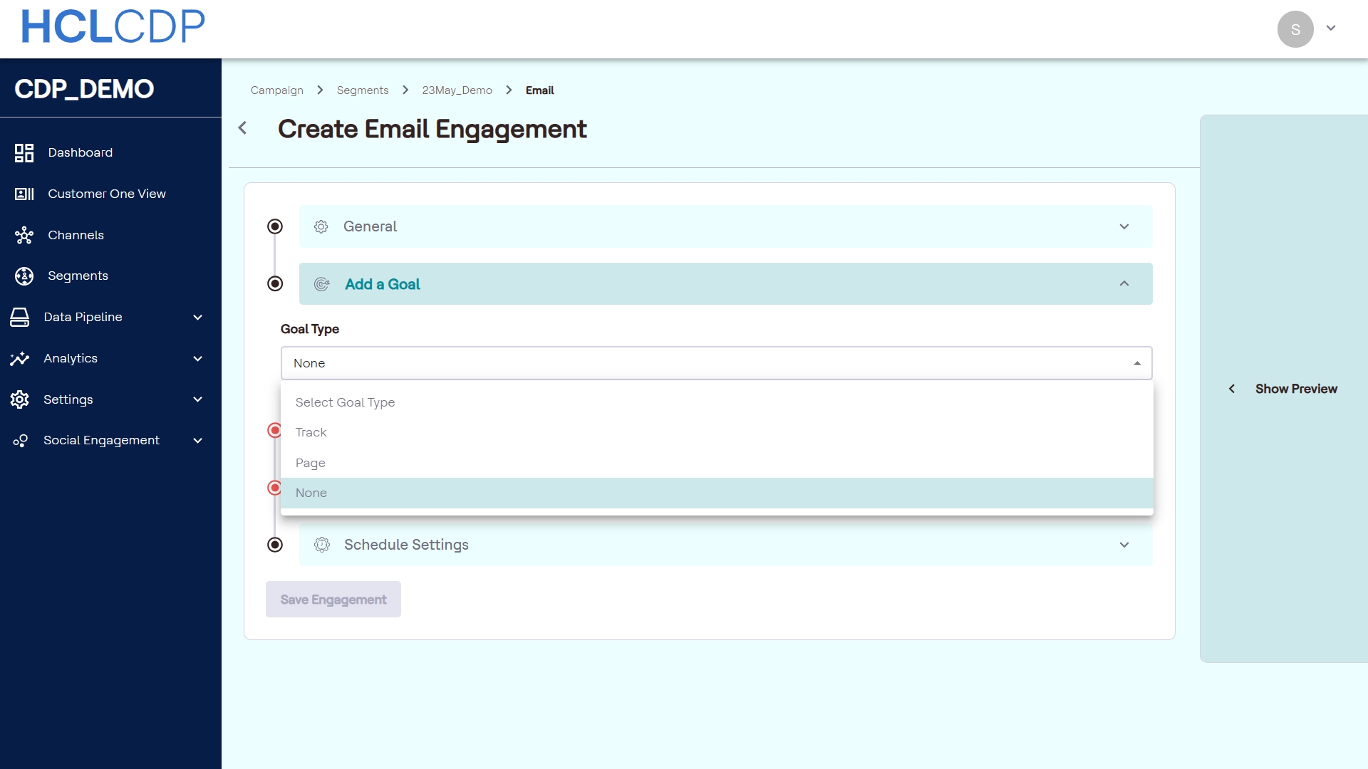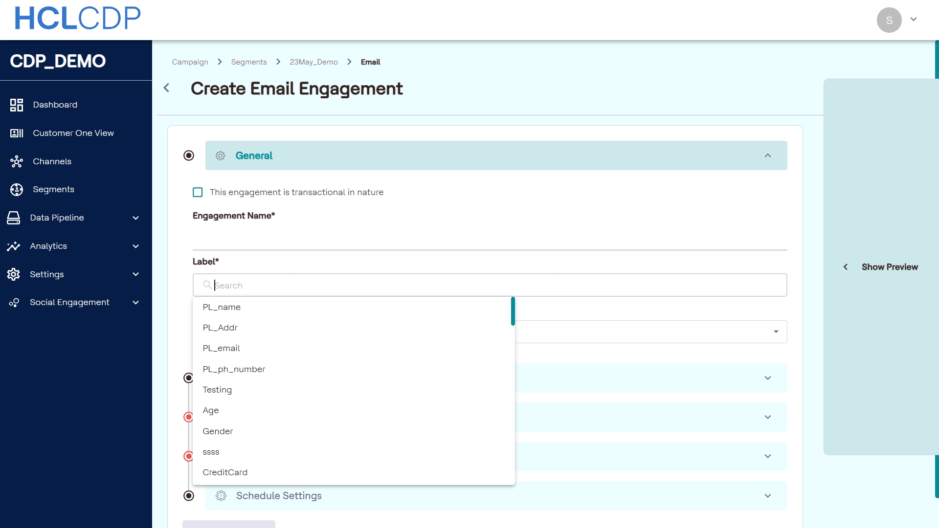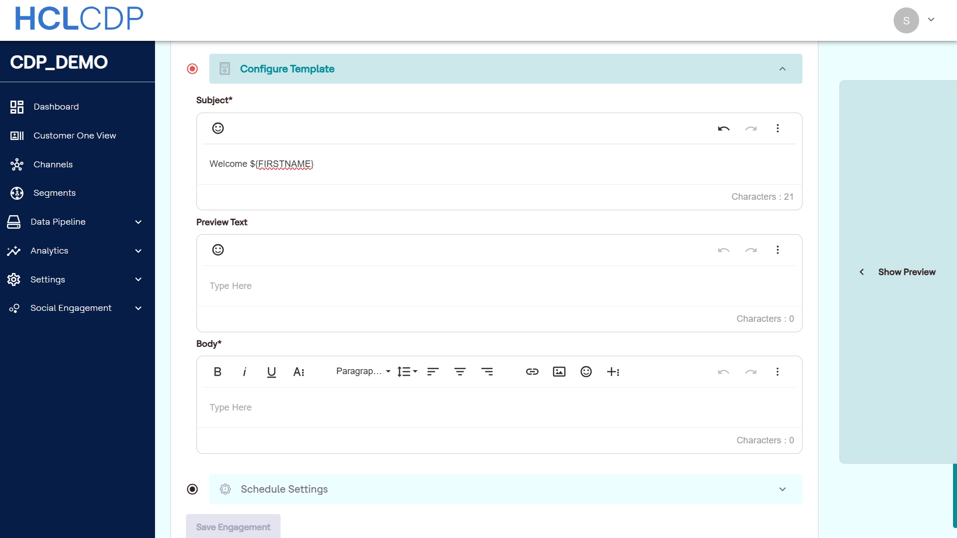 - Email: Deliver customized email campaigns through HCL CDP’s email channel to engage your target audience.