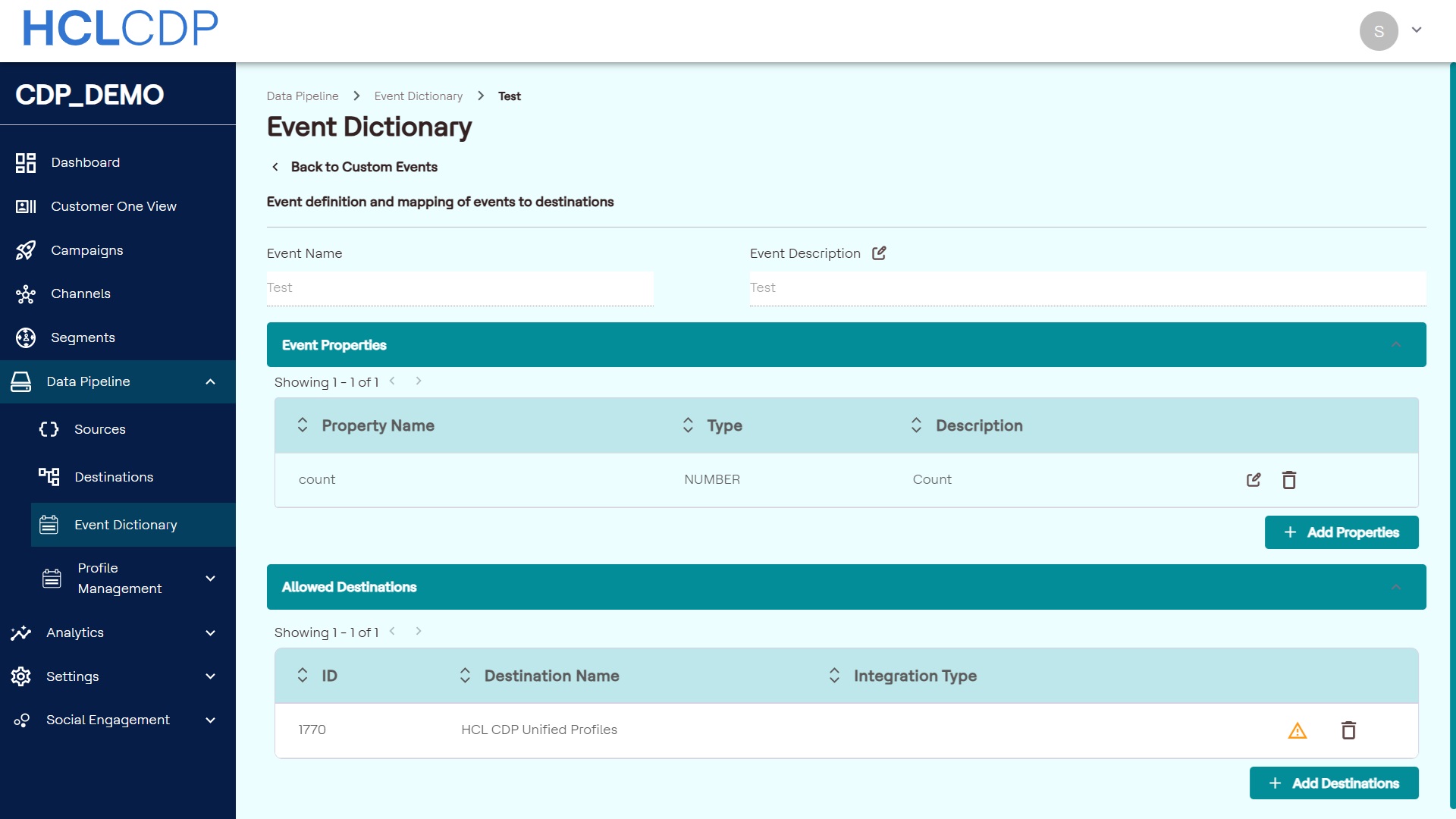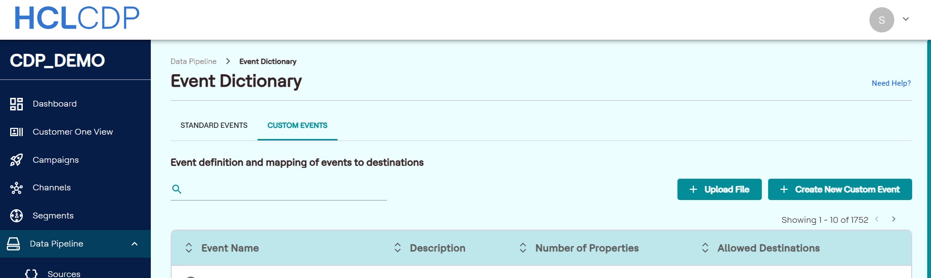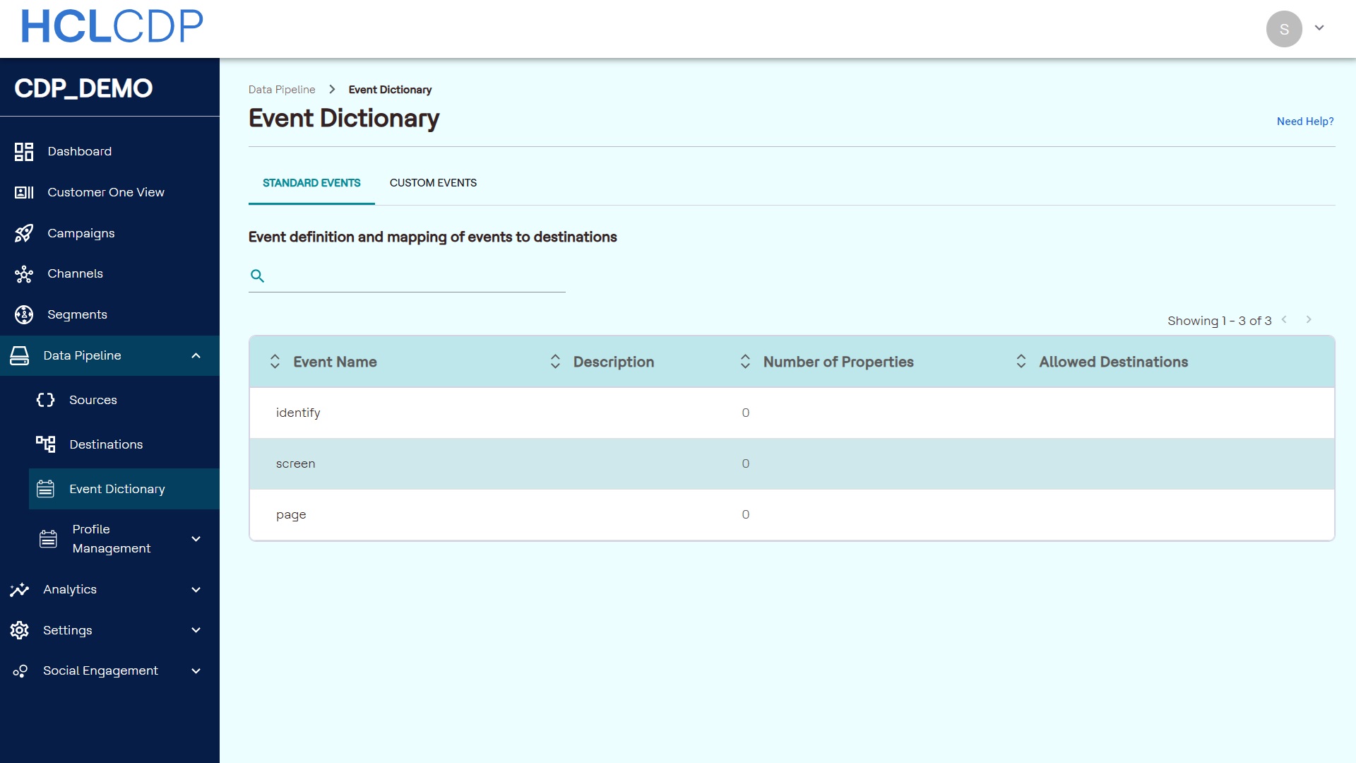 Standard events are pre-configured by HCL CDP, and include the following methods page, screen and identify.