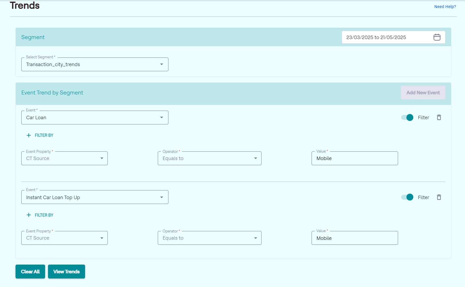 - Further, to add another event from the segment, click Add New Event and follow the above two steps.