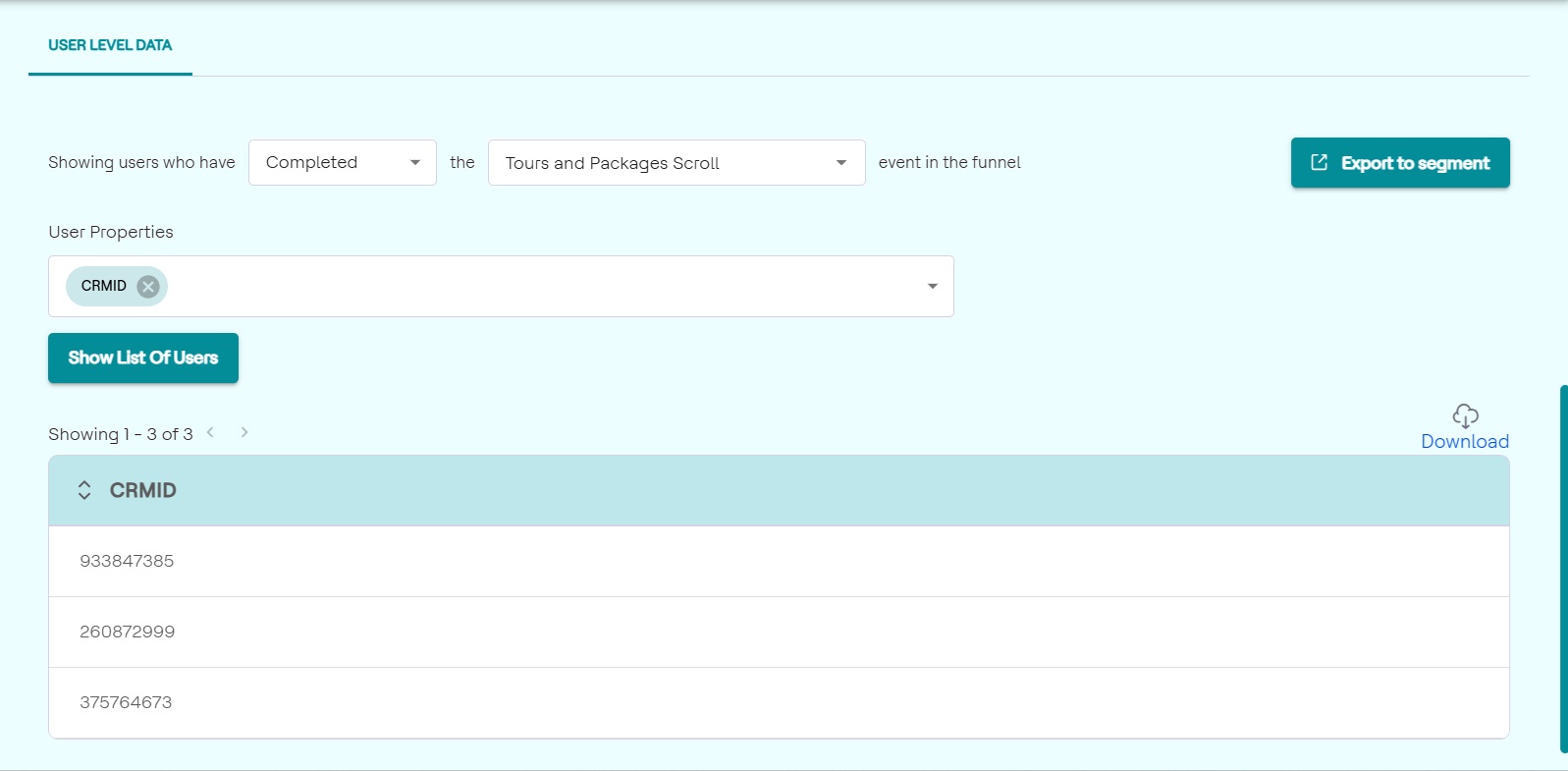 User-level data provides detailed insights into individual users who have not entered a specific funnel or have exited the platform without achieving the desired goal. This data helps marketers identify these users, analyze their behavior, and export their details into segments for targeted retargeting campaigns.