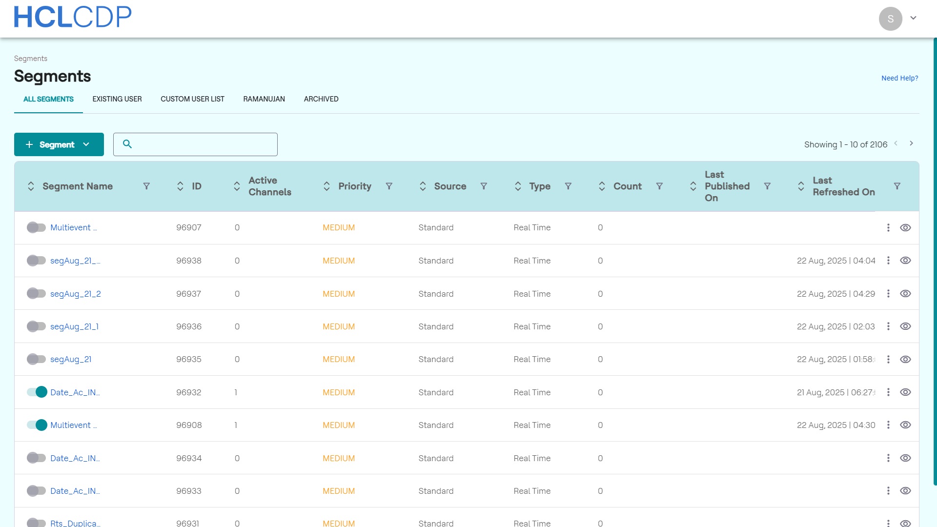 The Segments page displays all active, existing users, journey and archived segments and includes the following attributes:
