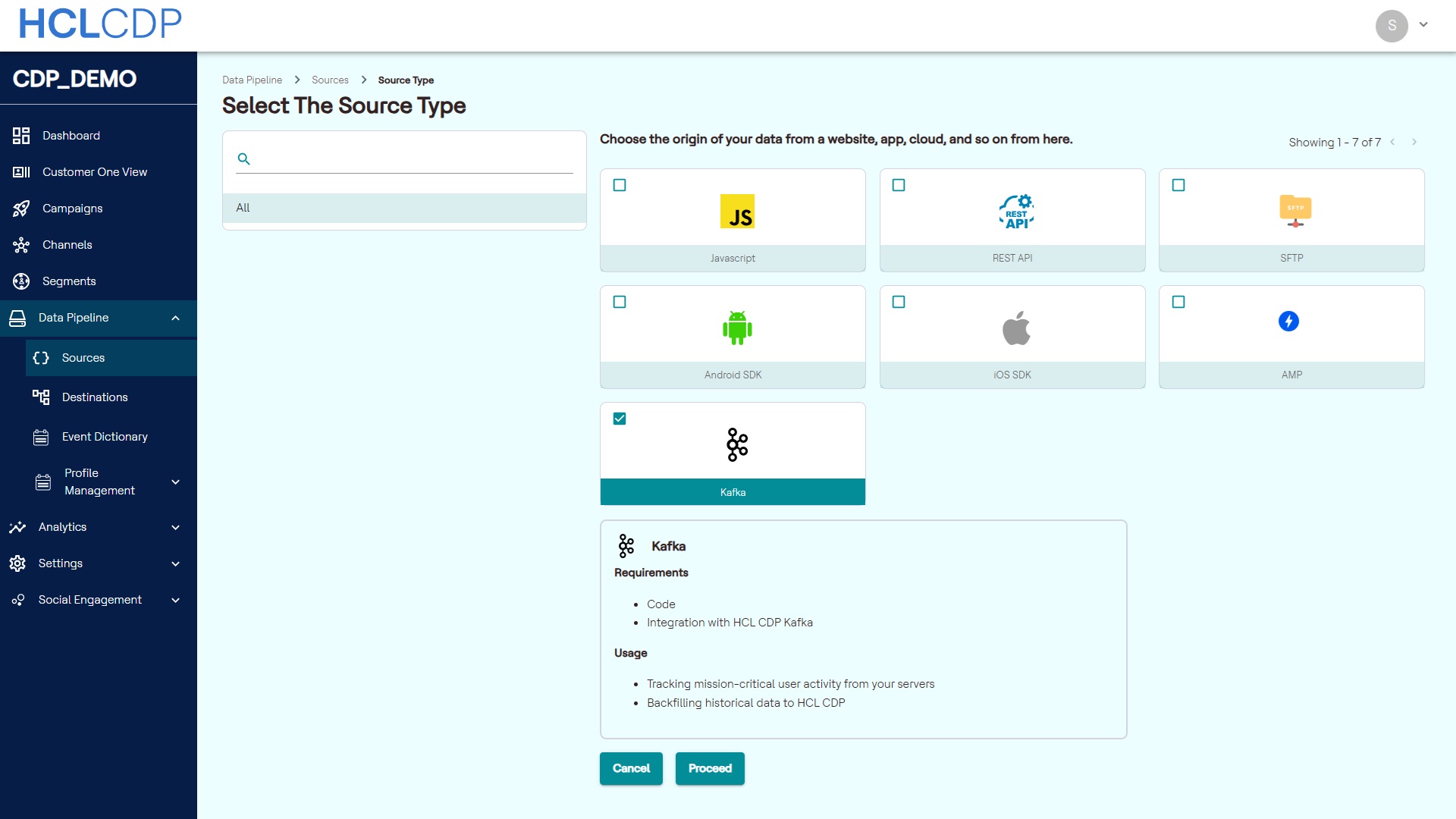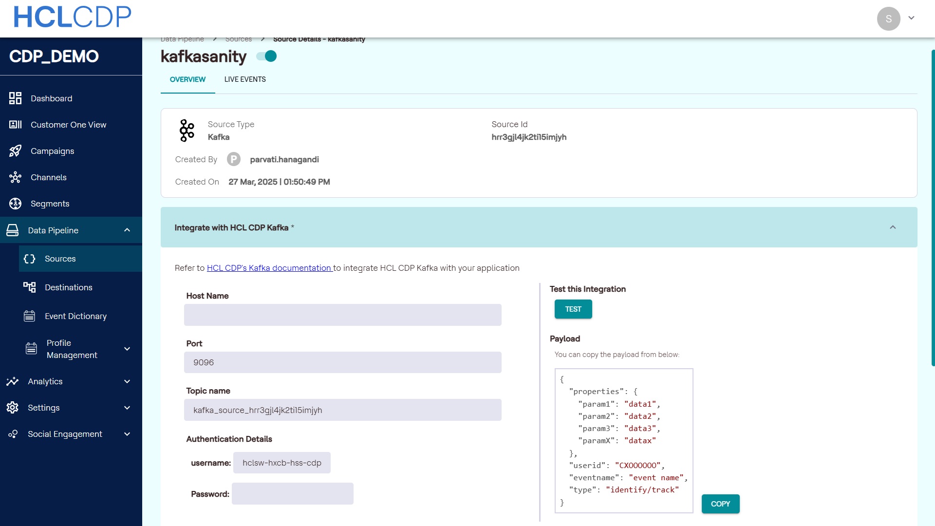 Kafka serves as a source in HCL CDP, enabling data transfer from your Kafka producers to HCL CDP. It is ideal for handling high volumes of streaming data in real-time.