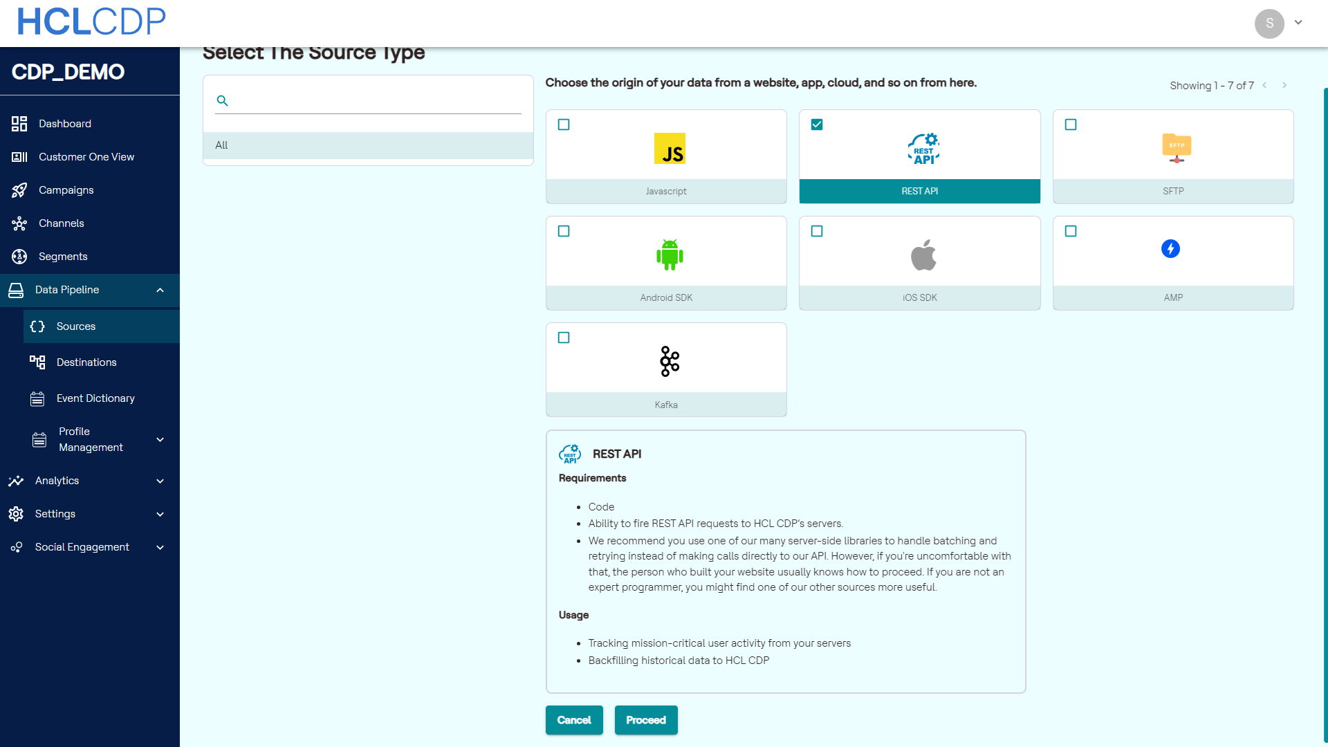 - Select the source type as REST API, and click Proceed.