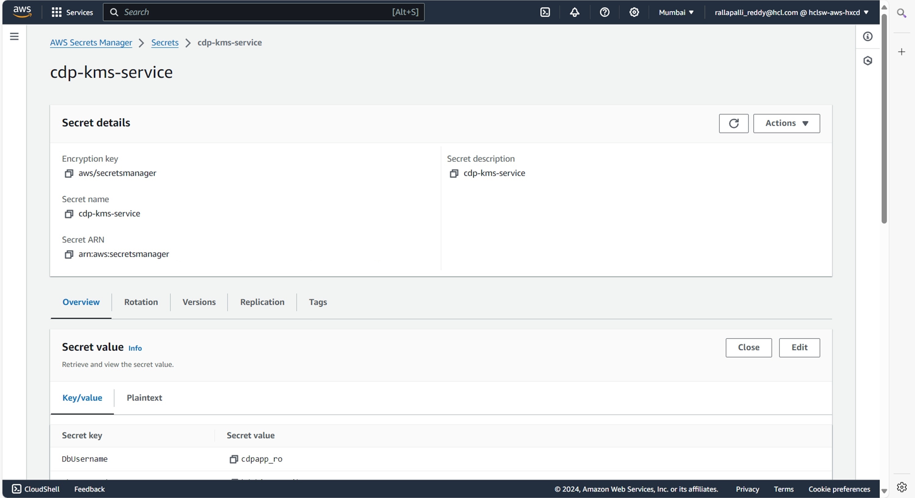 To create the cdp-kms-service secret in the AWS secret manager, follow the steps below: