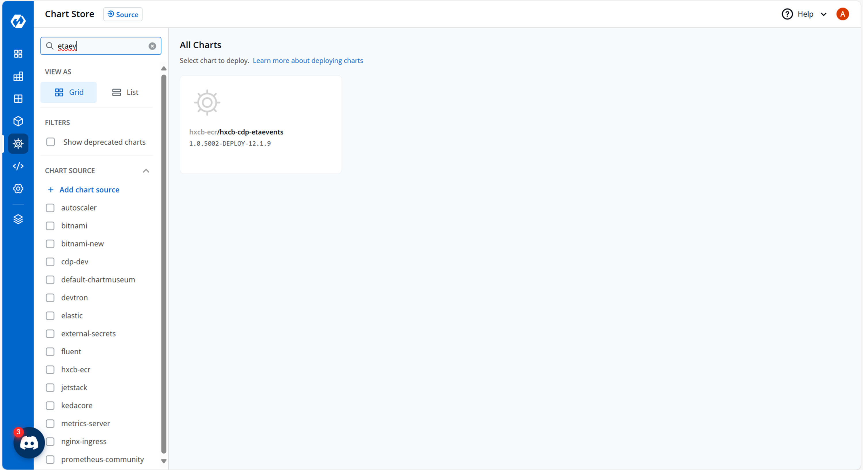 - Navigate to the Devtron Chart Store, and select the cdp-etaevents chart to