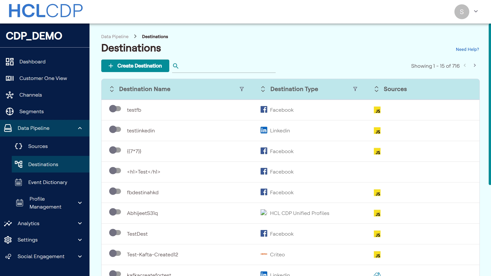 A destination in HCL CDP (Customer Data Platform) refers to a pre-built integration that allows seamless delivery of event data to various platforms. These events can be utilized on the integrated platforms for purposes such as marketing, analytics, or other operational needs.