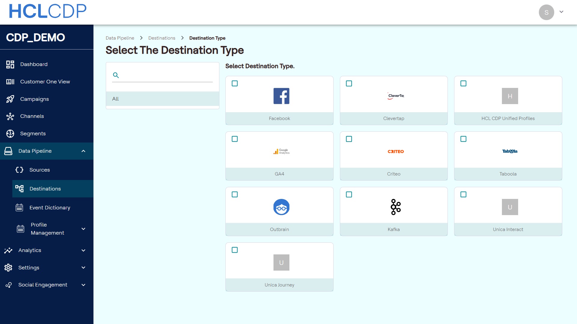 - Navigate to Data Pipeline > Destinations, and click +Create