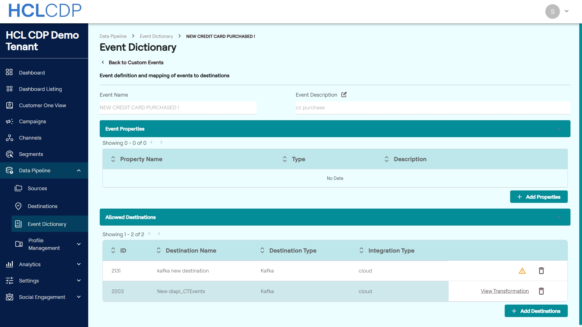 - Navigate to Data Pipeline > Event Dictionary, and select the Event Transformation tab.