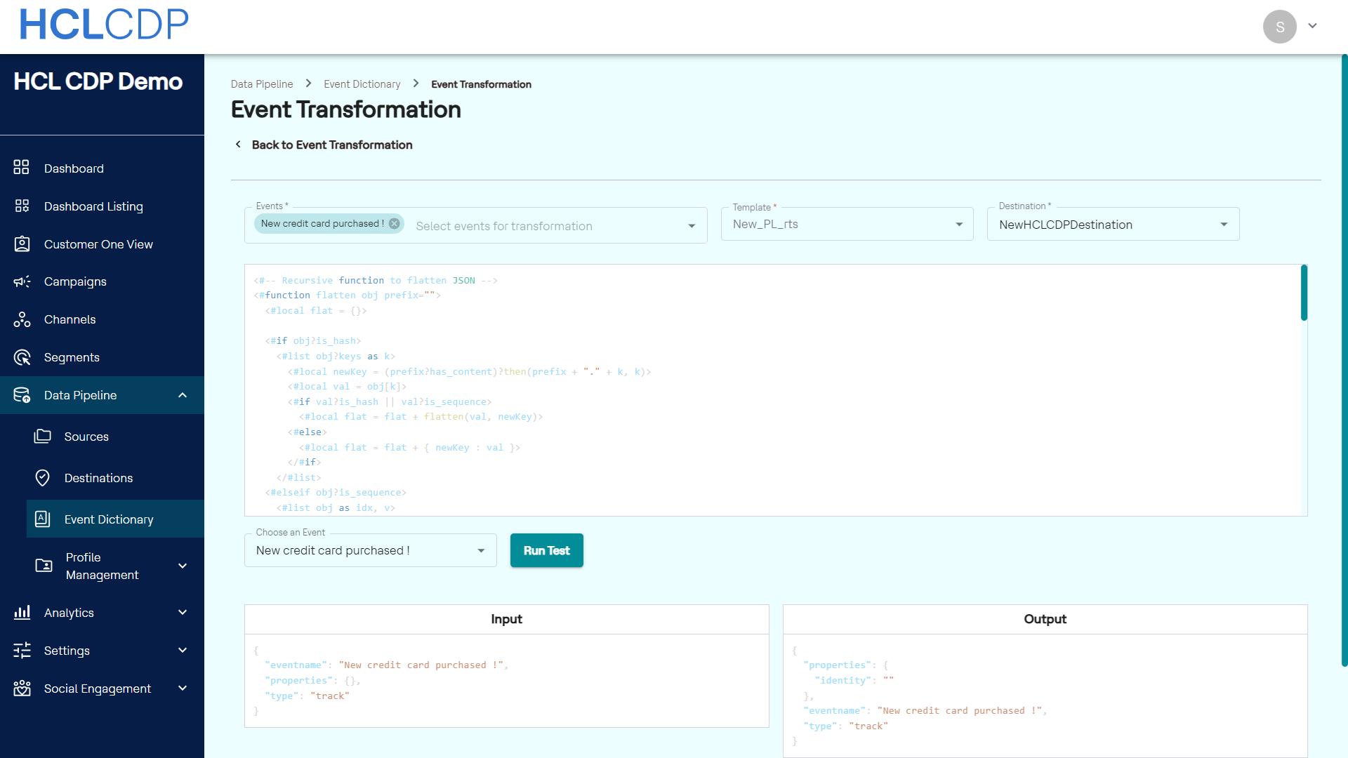 generic_base_template) or a custom template. As a result, the template will be displayed below in the code snippet. - In the Destination* field, select the specific destination where the transformed event data will be sent.