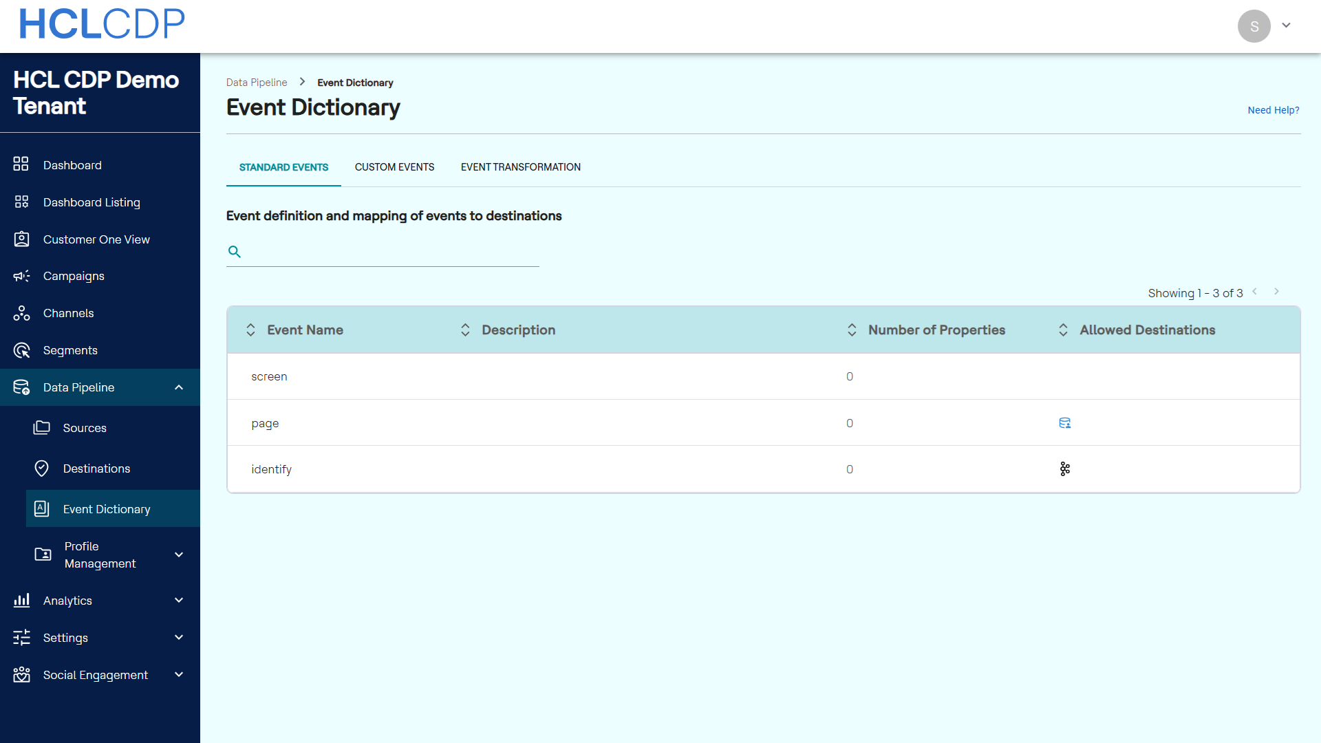 Events in HCL CDP are categorized into Standard Events and Custom Events.