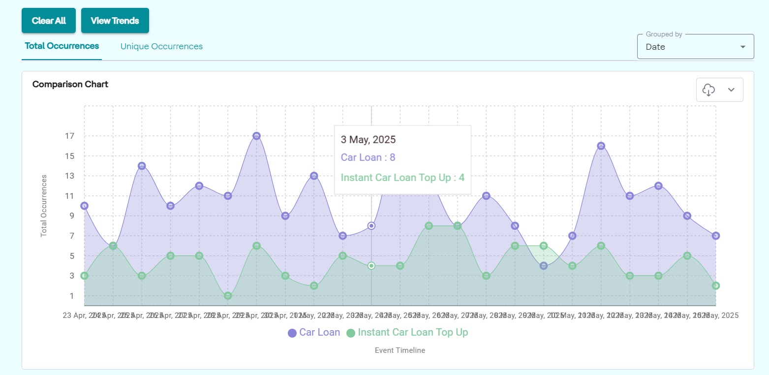This page provides a visual representation of user event data over time. You can compare customer segments using up to two distinct events to analyze behavioral patterns across different cohorts. This limitation applies to all filtering, matching, and logical evaluation operations involving event data within segment definitions.
