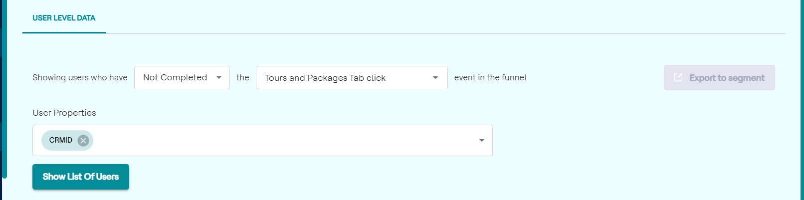 User-level data provides detailed insights into individual users who have not entered a specific funnel or have exited the platform without achieving the desired goal. This data helps marketers identify these users, analyze their behavior, and export their details into segments for targeted retargeting campaigns.