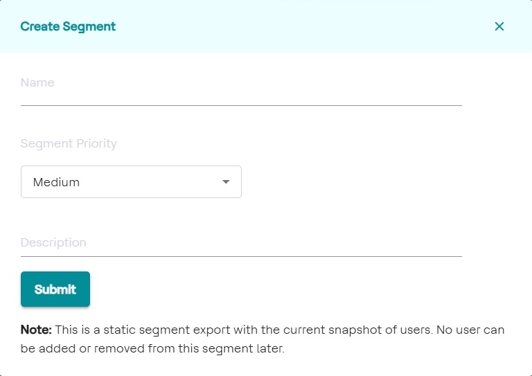 - Create Segment: Name your segment, set priority, define its type,