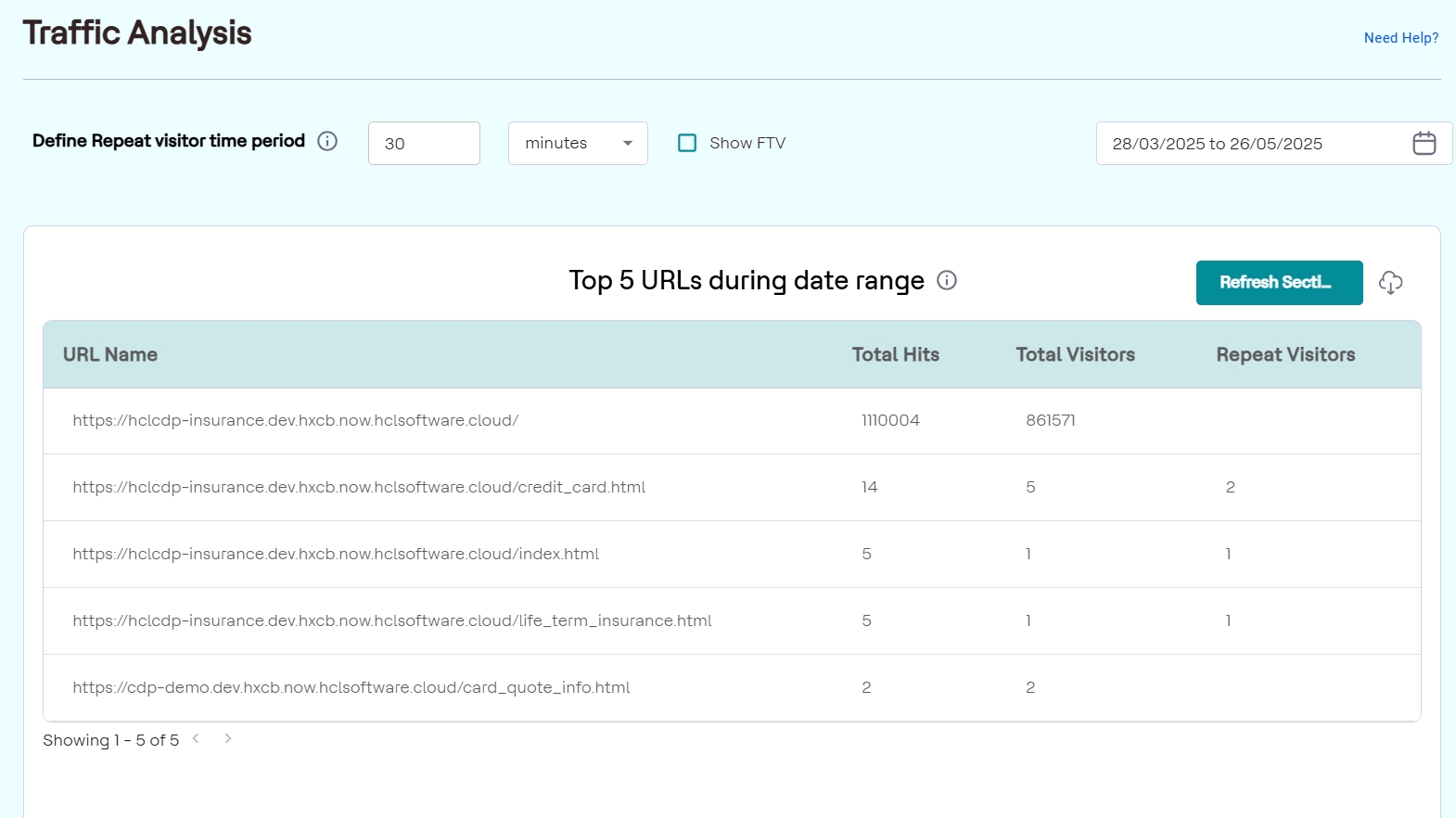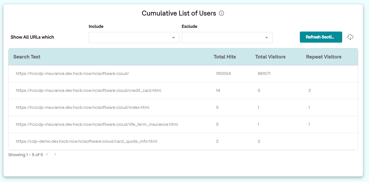 - Click Refresh Section next to Top 5 URLs during the date range to view the list of users or cumulative data.