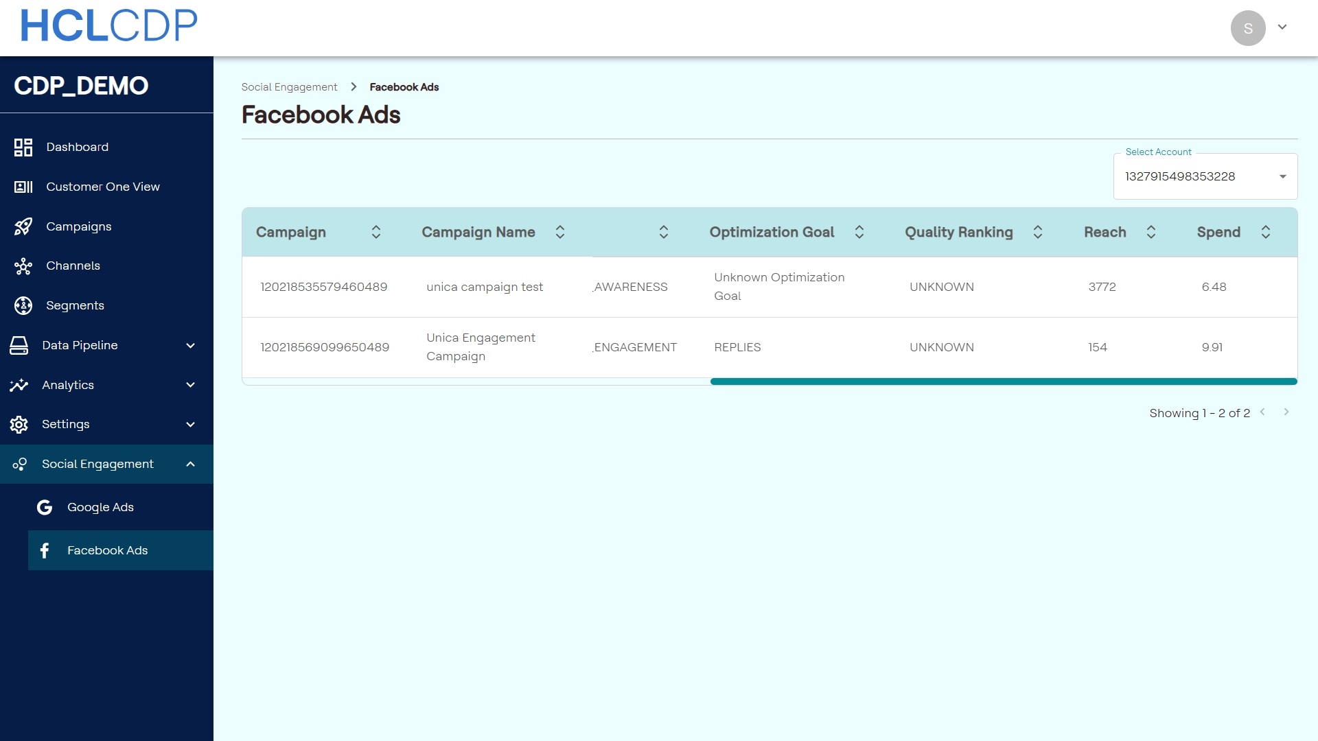 The Account drop-down list displays all the accounts under Business Account for Facebook. Select an account, and based on the selected account, the page displays the key metric details as shown below.