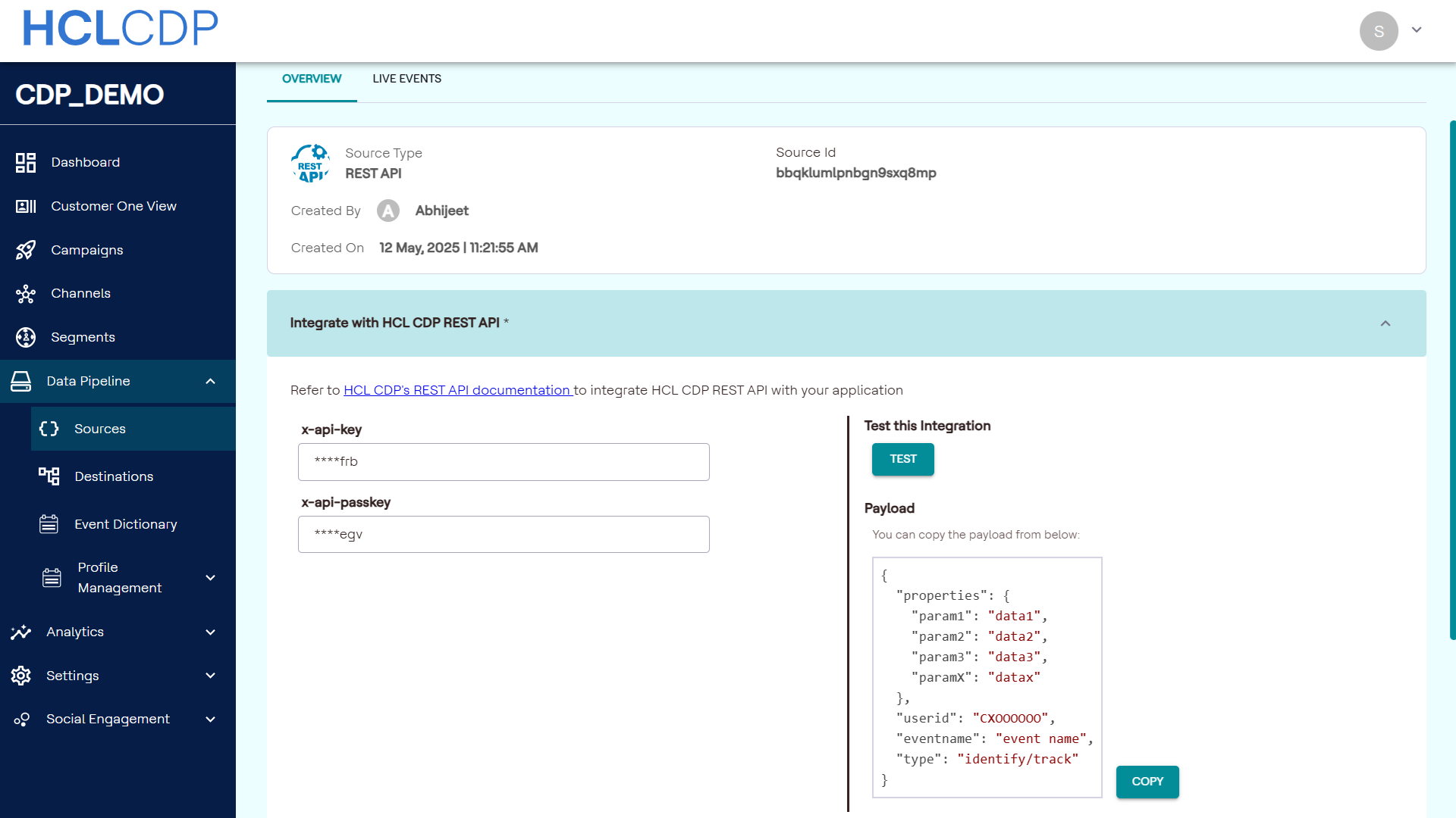 Payload Testing: A sample payload format for events is provided during the setup process. You can copy the payload and use it while sending API requests.