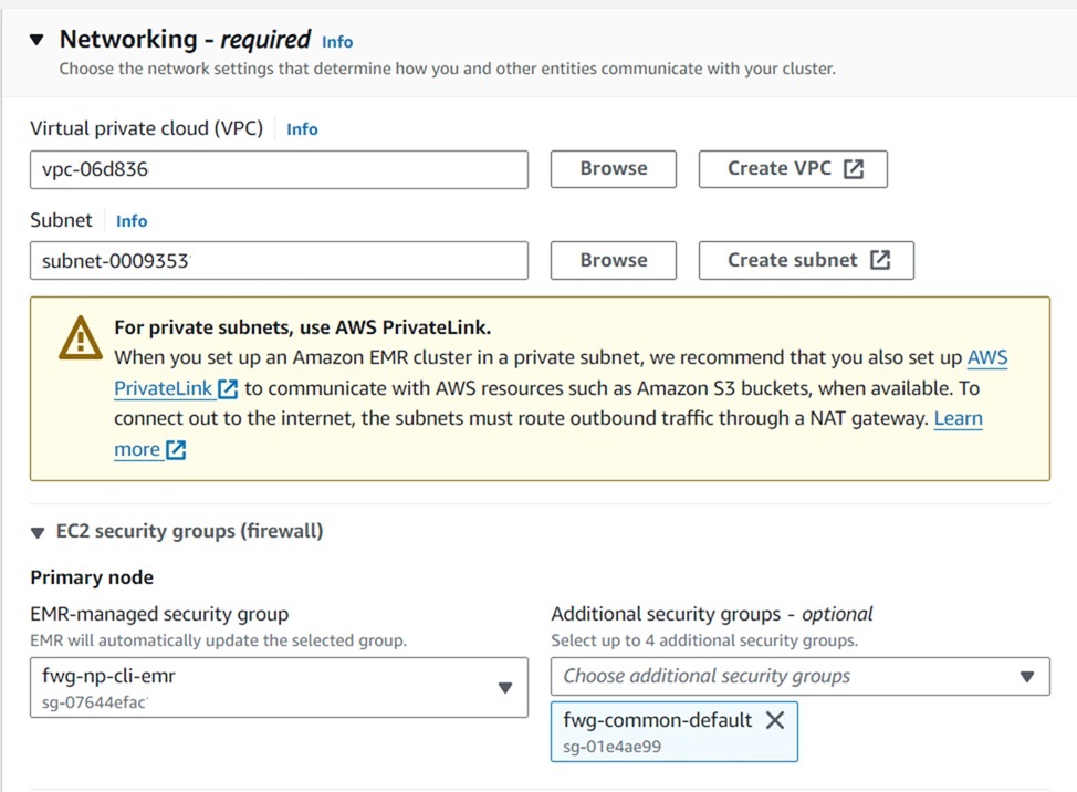 - Add the Virtual private cloud (VPC), Subnets and Security Groups as shown