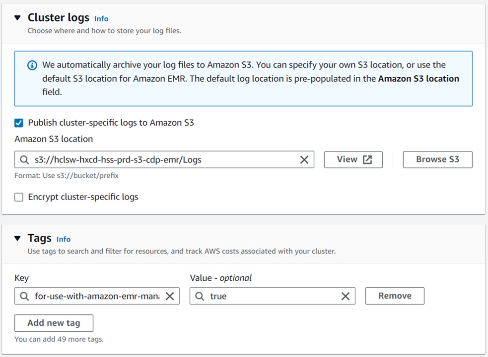- In the Cluster logs section, add s3 path for logs as S3://hclsw-hxcd-hss-prd-s3-cdp-emr/Logs.