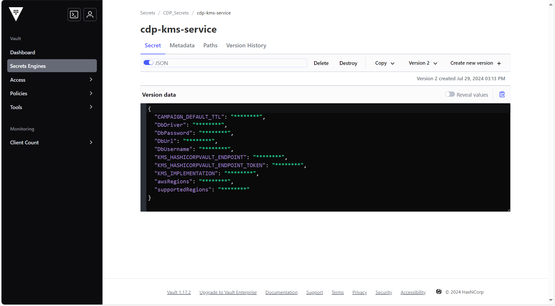 To create the cdp-kms-service secret in the HashiCorp Vault, follow the steps below: